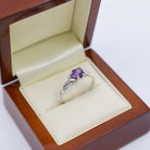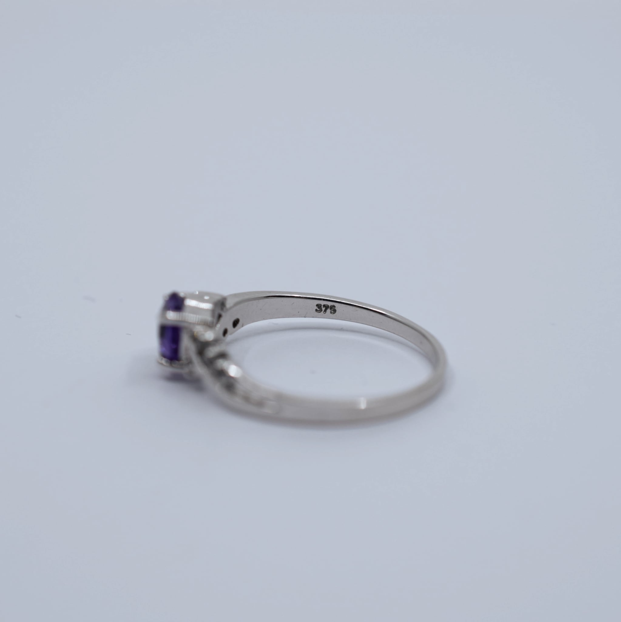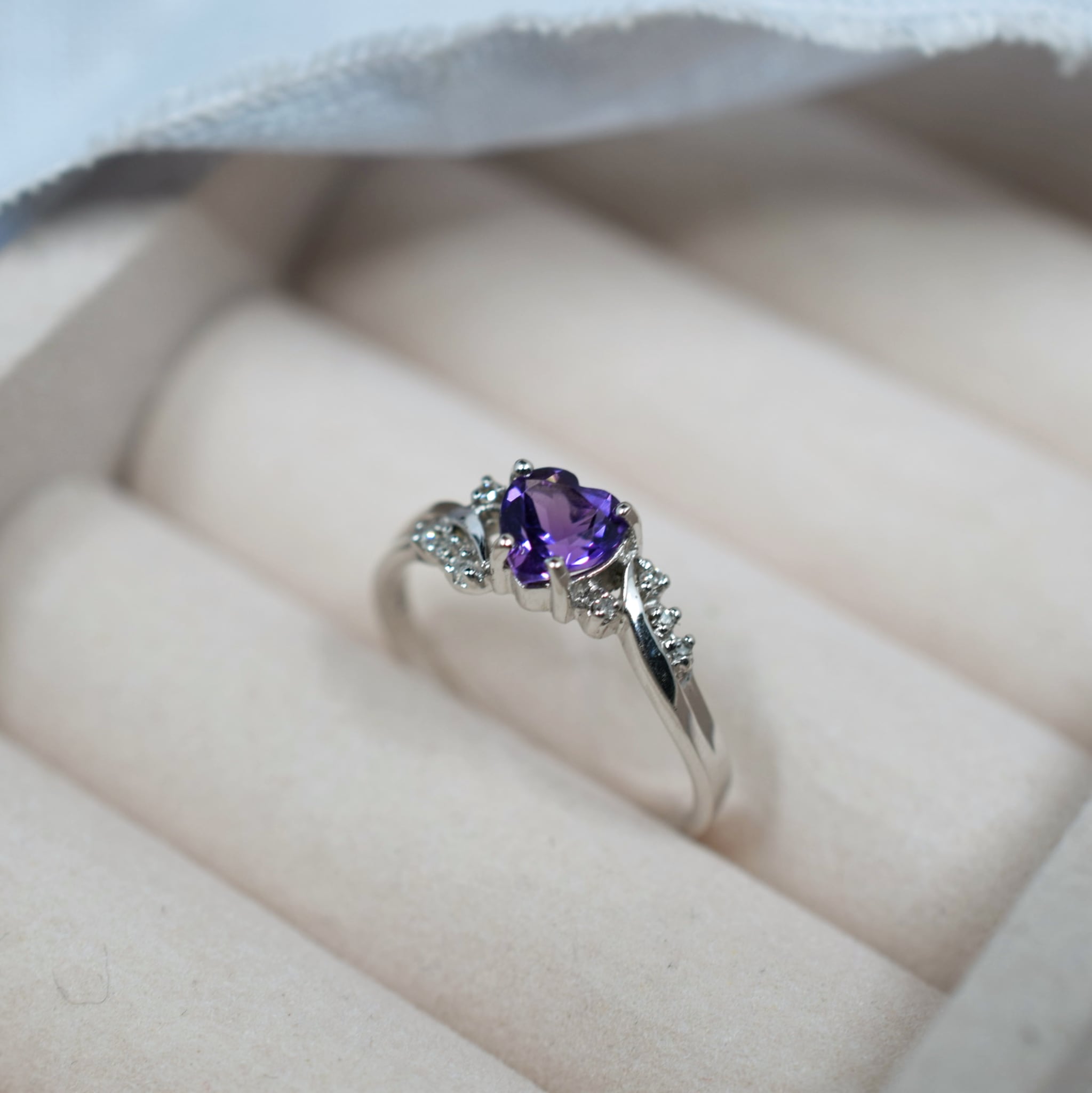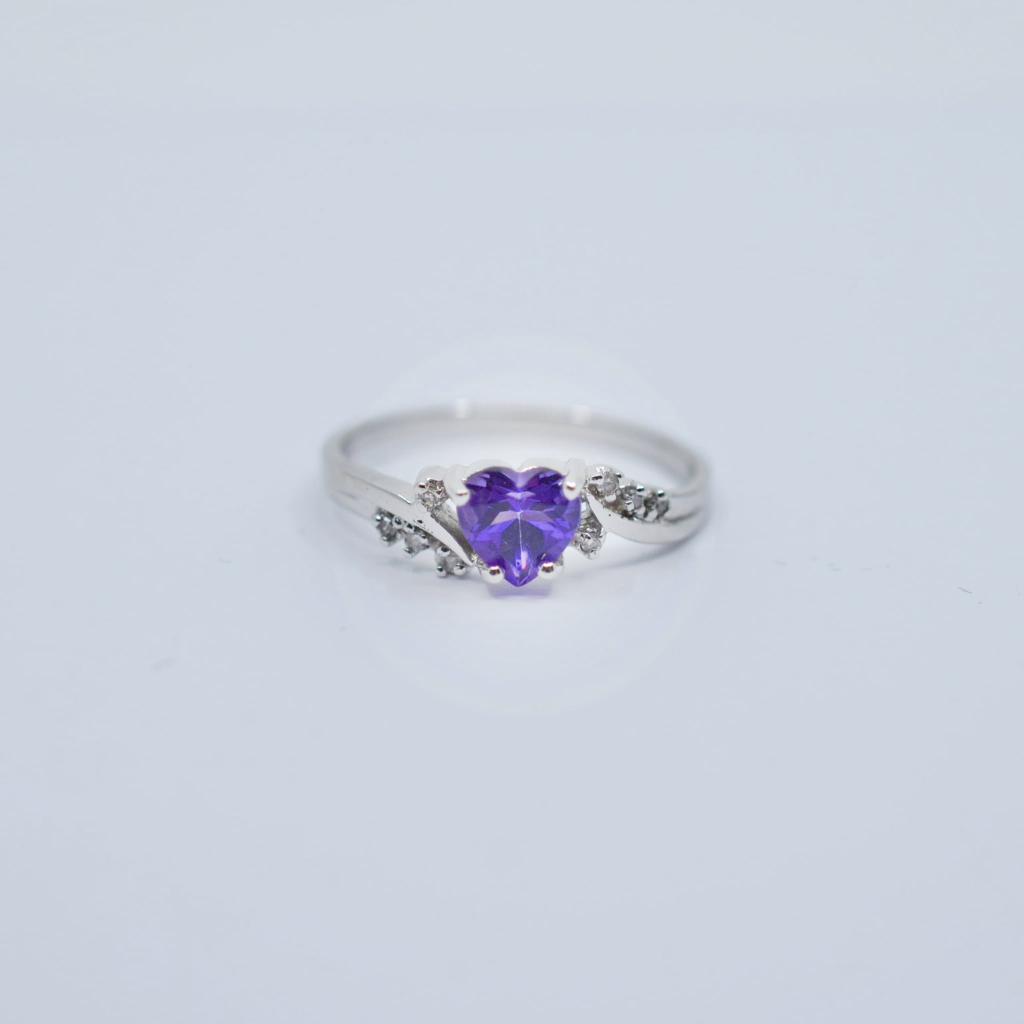 Made from 9ct white gold, this ring features a beautiful heart shaped amethyst with a nice rich purple colour. The claw set amethyst really shines in the contemporary bypass setting with diamond accents to add some extra interest to the ring. The band itself is nice and solid and hasn't been hollowed out inside near the shoulder.