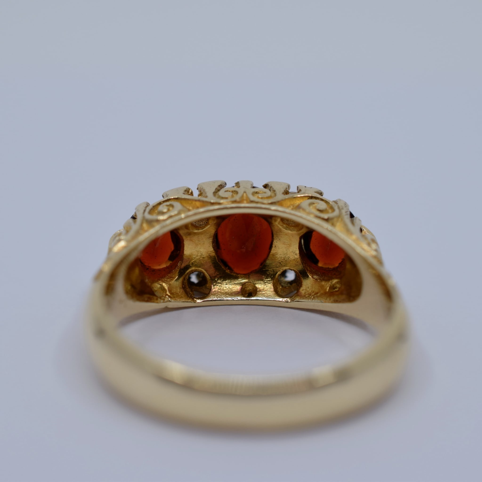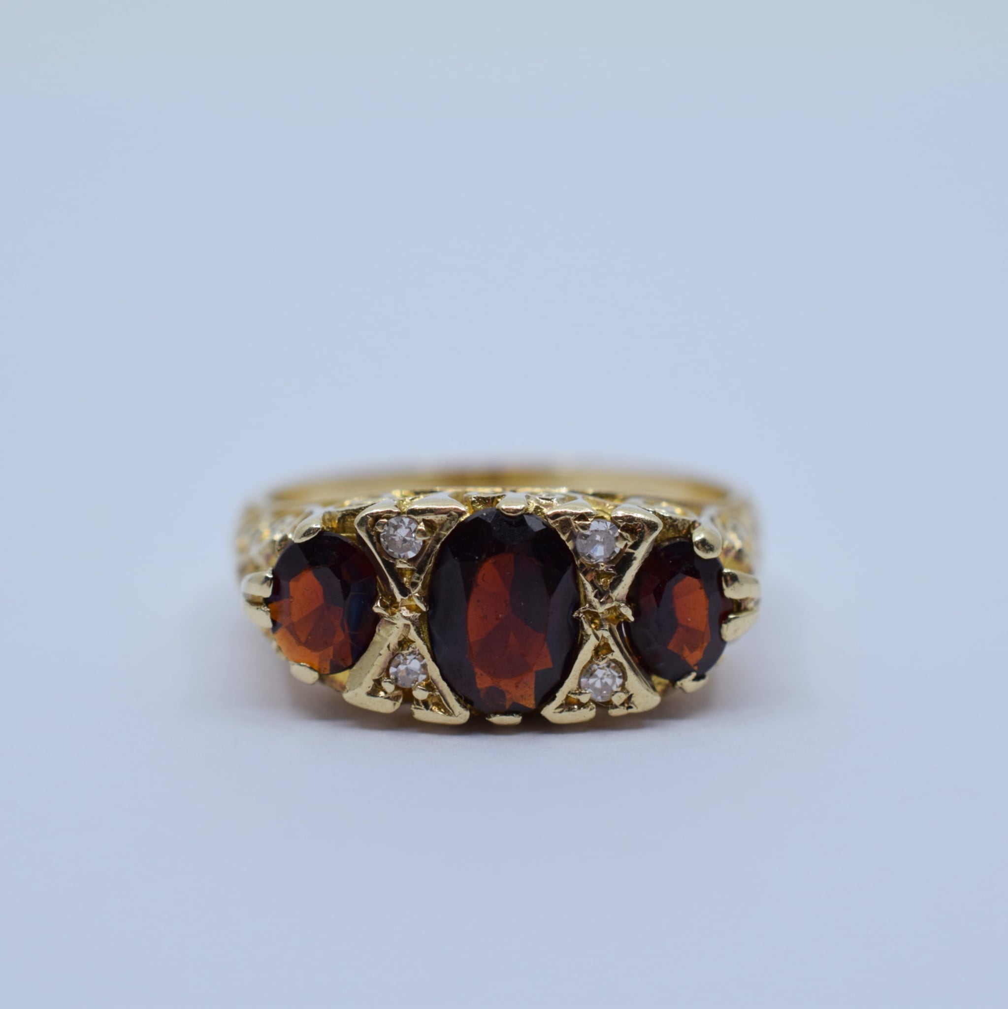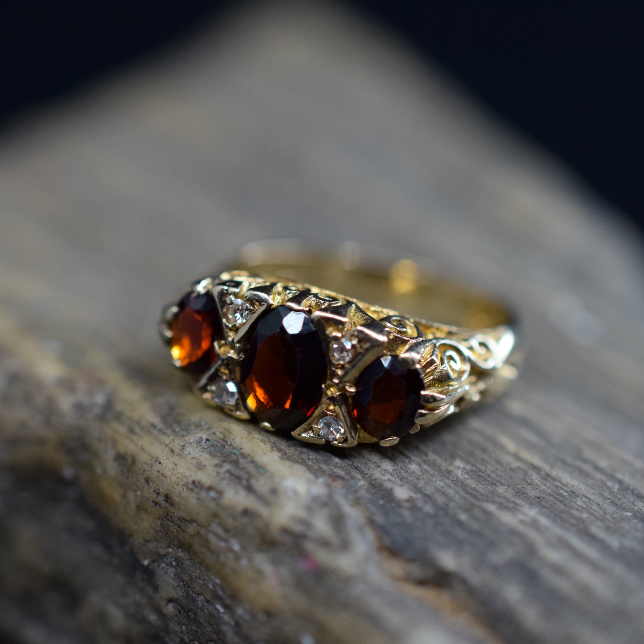 This absolutely gorgeous 9ct gold ring in the traditional 'London Bridge' setting truly is a sight to behold. It features three rich oval almandine garnets with the centre garnet surrounded with four brilliant cut round diamonds. All beautifully set in an exquisitely detailed and engraved setting with detail down the shoulders. The piercing in the gallery allows light in and shows the stones off beautifully.