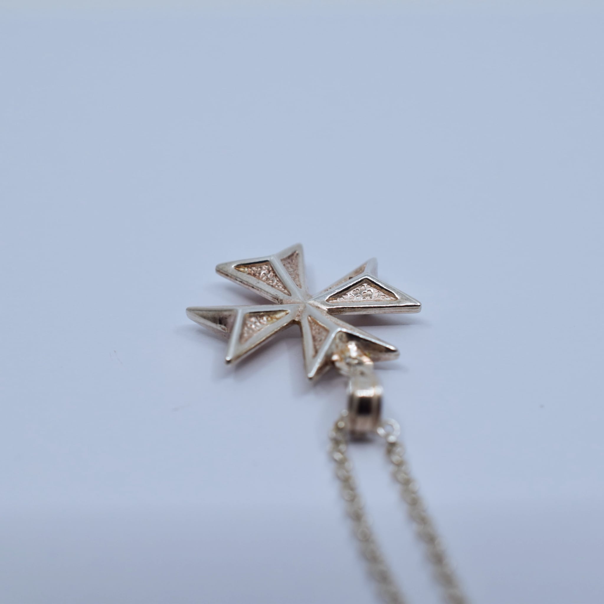 This beautiful Maltese Cross pendant has some uniqueness owing to the beautiful light red rhodium plating on the textured parts of the eight points in the design. Made from Sterling Silver, the texturing and addition of colour help bring some depth to the cross.