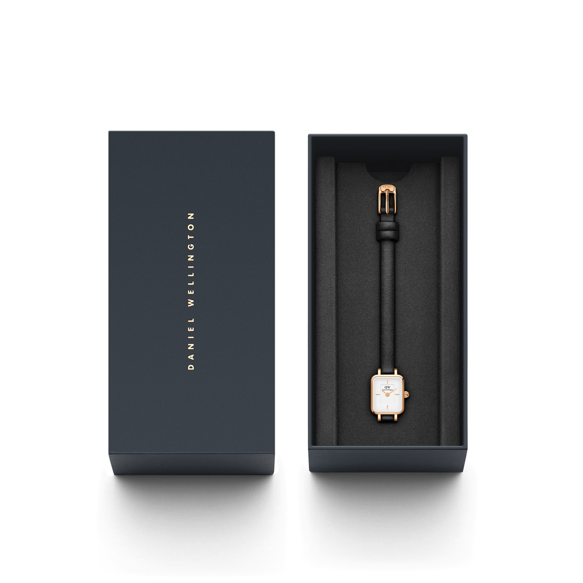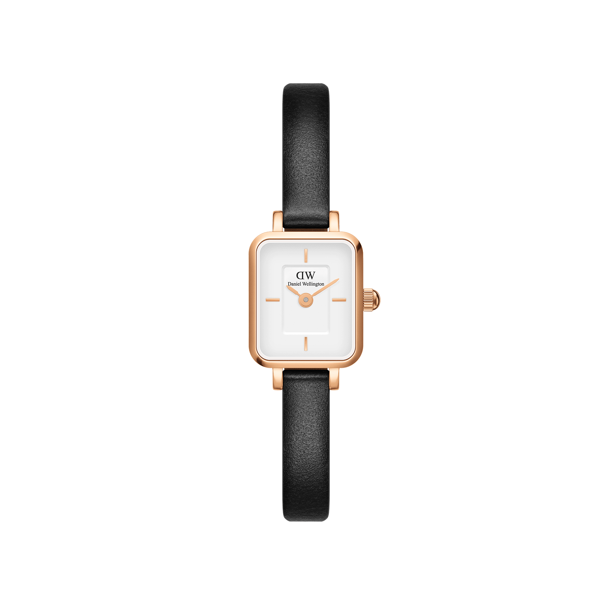 The cool corners of Quadro, shrunk down into our smallest watch ever. This rose gold version of Quadro Mini features an interchangeable black strap made from genuine Italian leather.