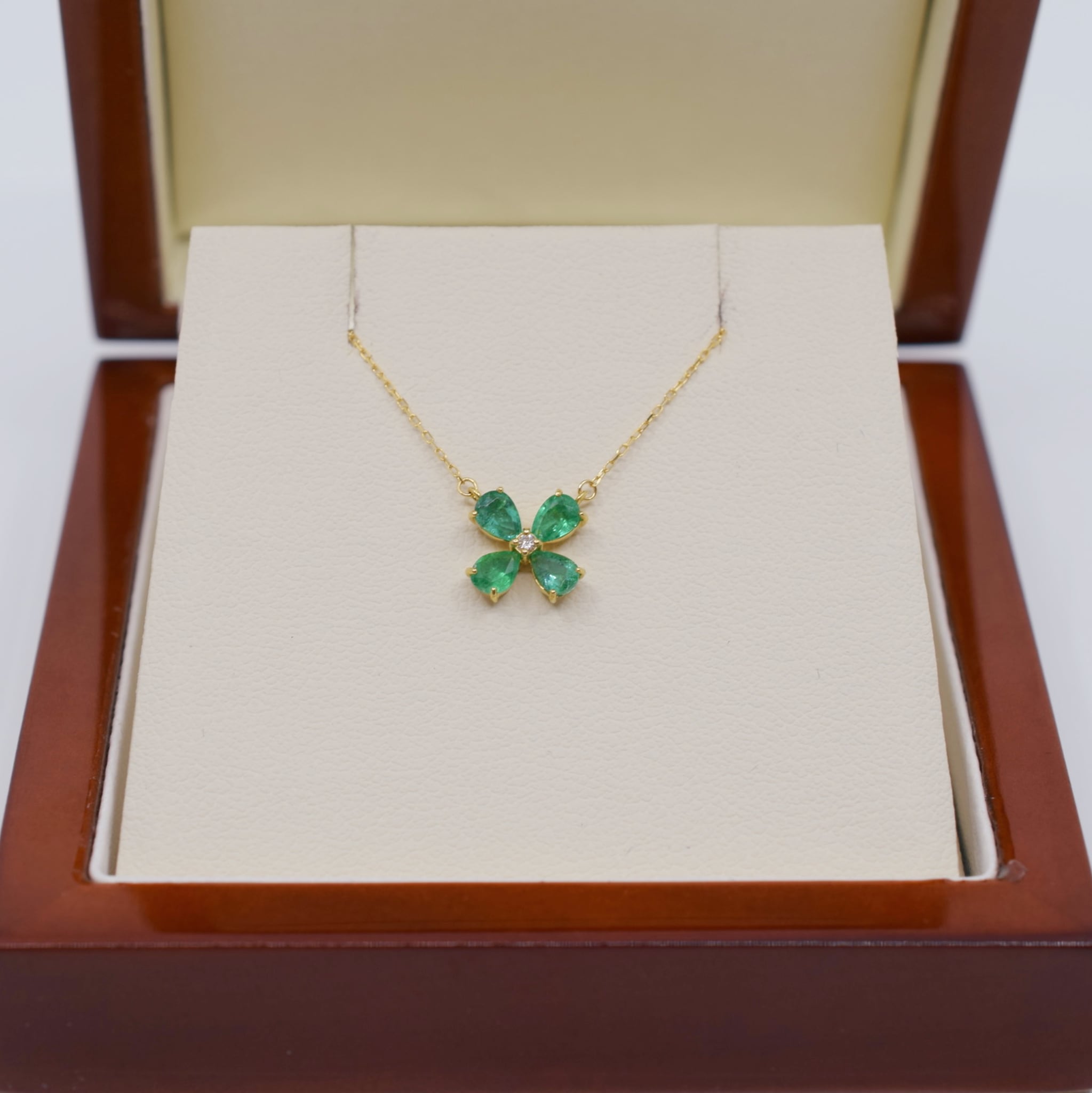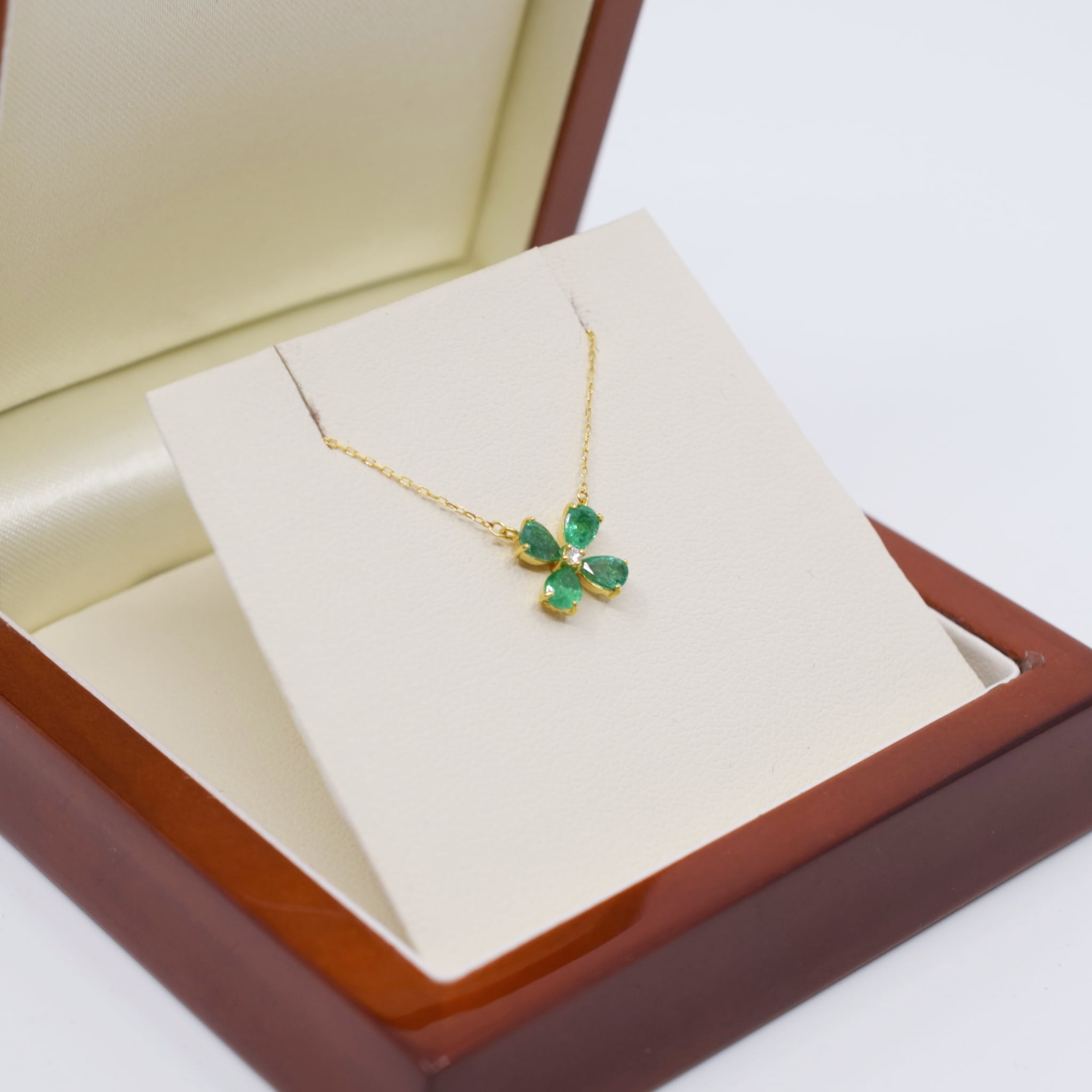 This necklace is just beautiful and what a way to showcase these radiant green emeralds. Made from 18ct Yellow Gold, the pendant features four stunning pear cut natural emeralds around a central round white diamond accent. The pendant is attached to an integral 18ct Yellow Gold 40cm fine trace link chain.