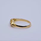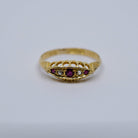 What an exquisite ring. Crafted from beautiful 18ct Yellow Gold it features three stunning rubies and two rose-cut diamonds that have been set into a pierced bridge setting and carved triangular shoulders.