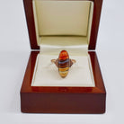 This ring is crafted in 9ct Rose Gold and contains the most beautiful oval banded agate stone. The 17mm x 7mm banded agate oval cabochon really sets the ring alight with its distinct horizontal banding with tones of oranges and whites. Set in a handsome bezel setting with millegrain edging and the graduated rectangular shoulders, it is a very thoughtfully crafted piece.