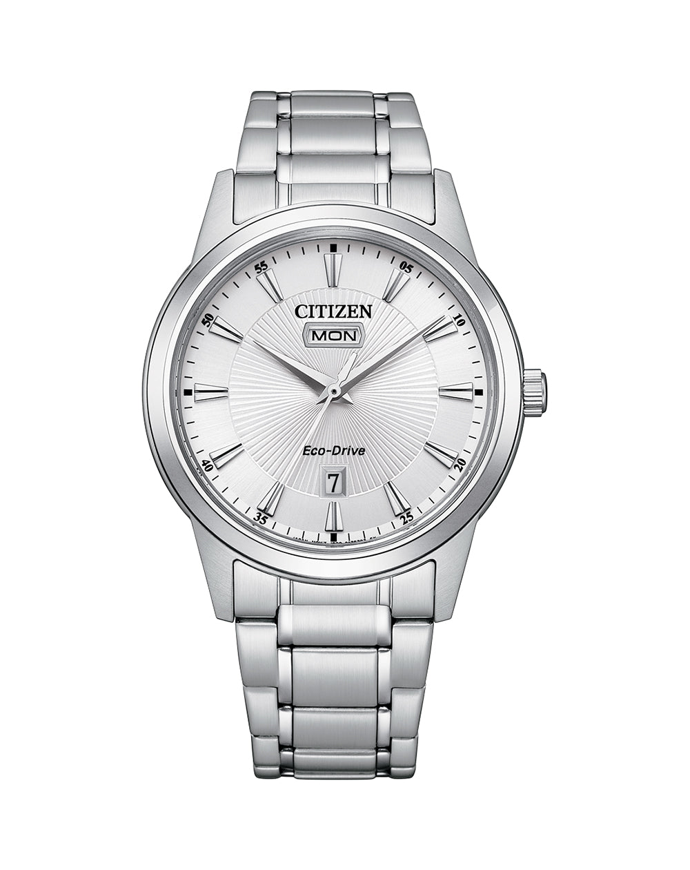 A modern timepiece that displays classic aesthetic appeal. The looks of this watch are equally matched by its reliability. A smooth silver/white sleek dial and stainless steel bracelet. Features include Day/ Date, and low charge indicator. Powered by our Eco drive, never needs a battery, only a light source.
