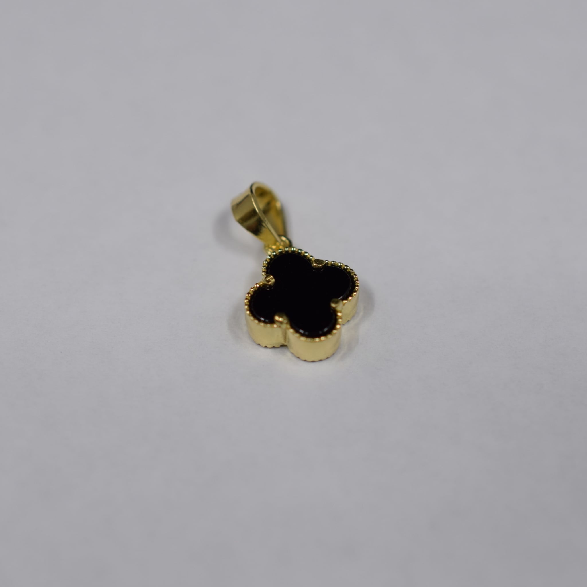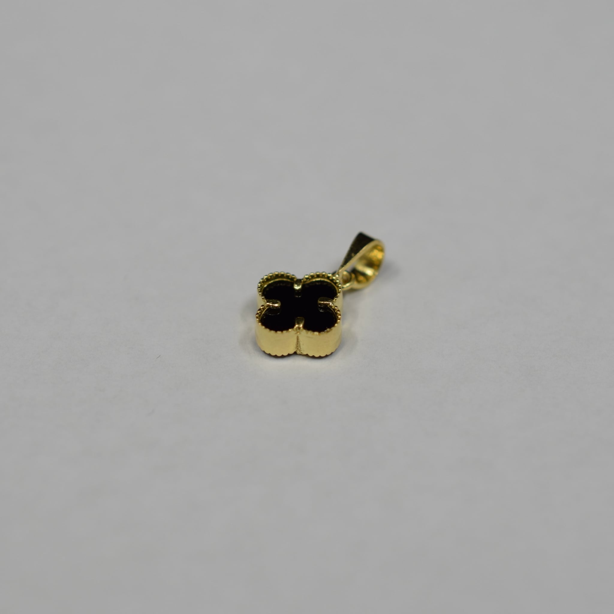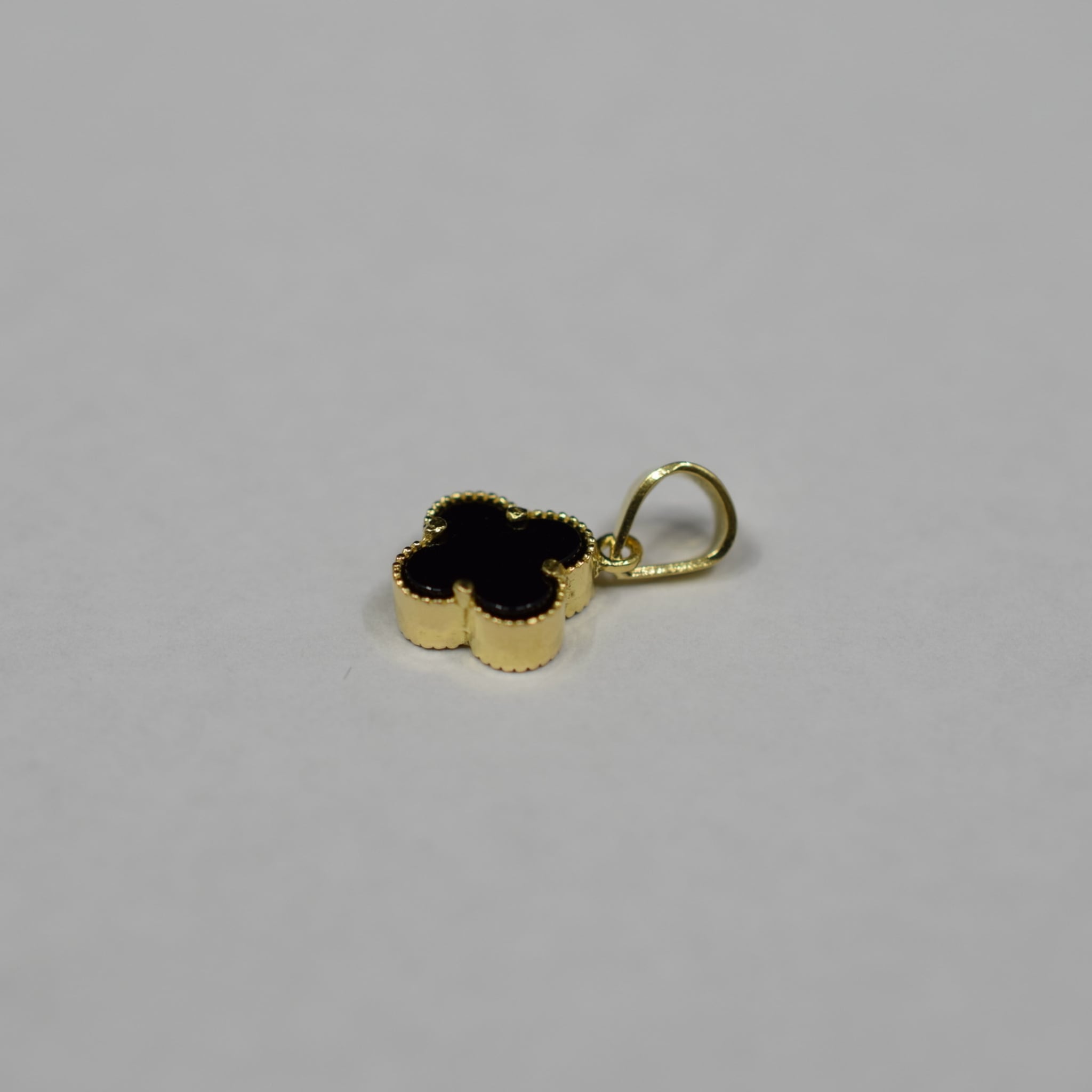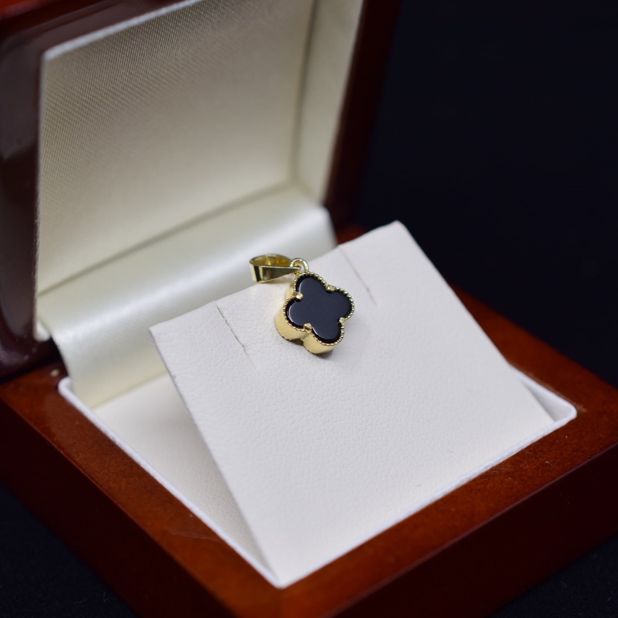 This beautiful Alhambra style pendant is crafted with rich 18ct Yellow Gold with the striking contrast of black onyx. The onyx is bezel set with a gorgeous millegrain edging that adds that extra detail.