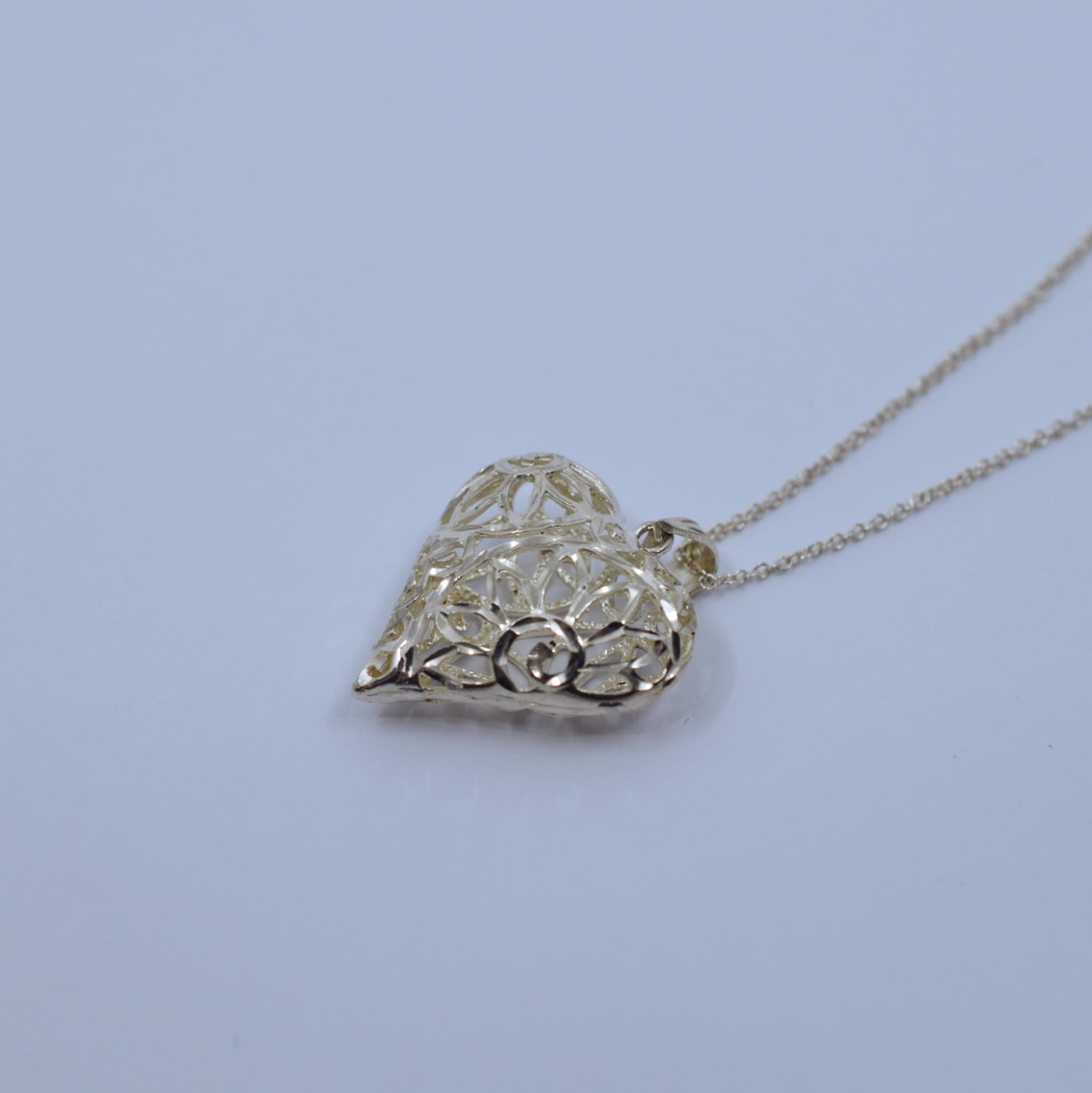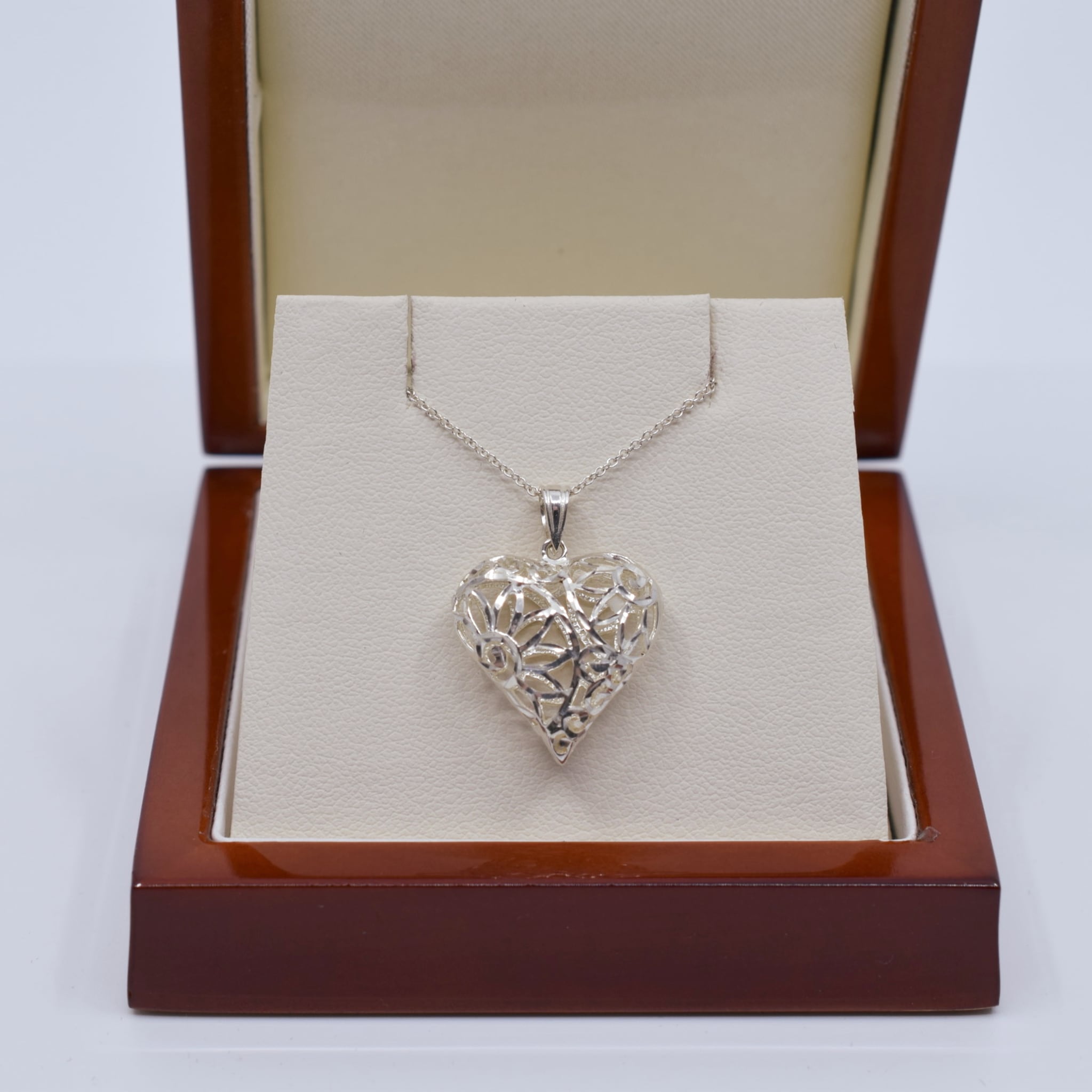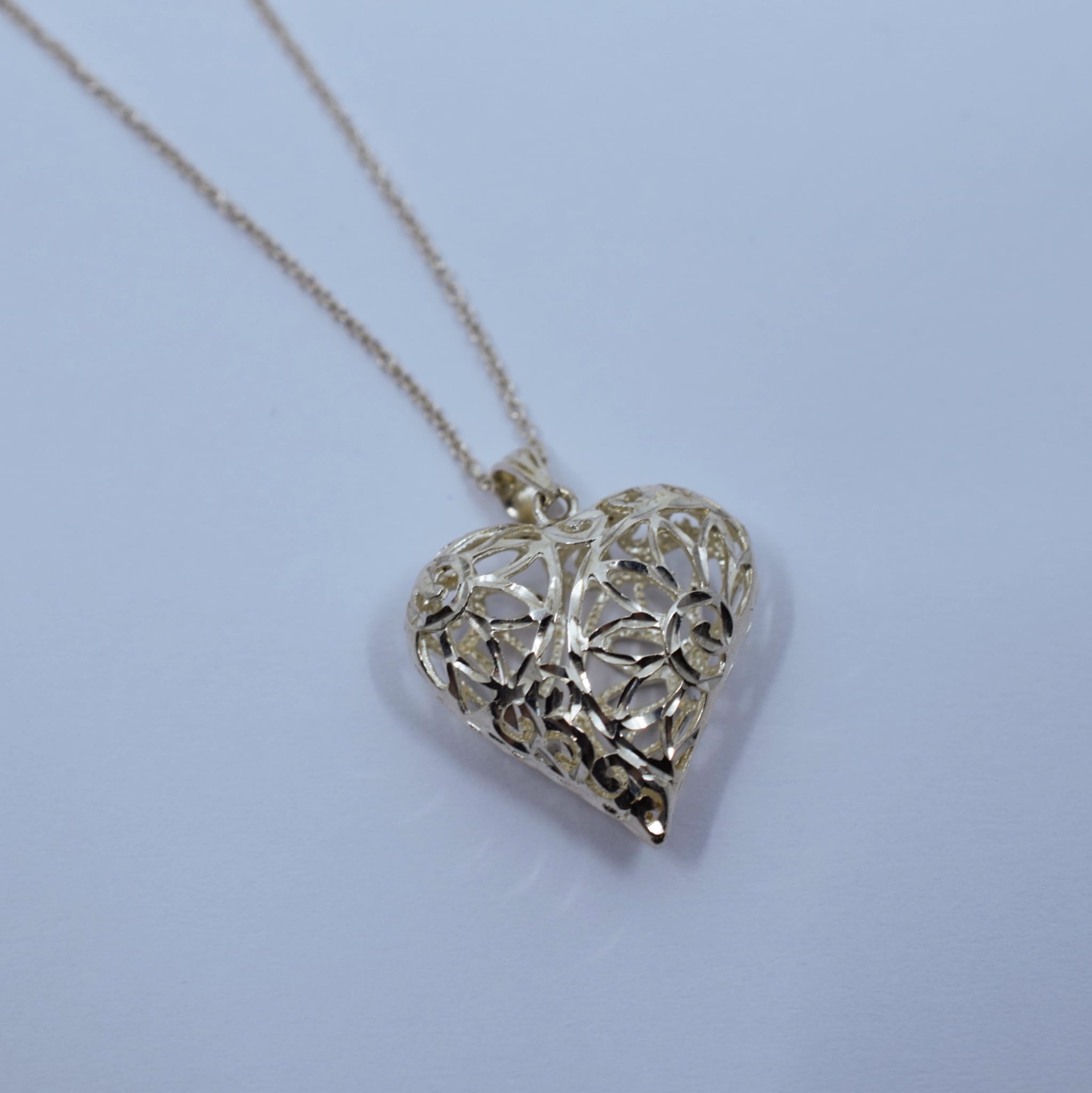 Made from Sterling Silver, this is a really different take on the traditional heart pendant. Rather than being solid or simply flat, it has been made with two halves which have been welded together. Each half features a two flowers which wrap around the pendant so one half of the flower is on one side and one half is on the other.