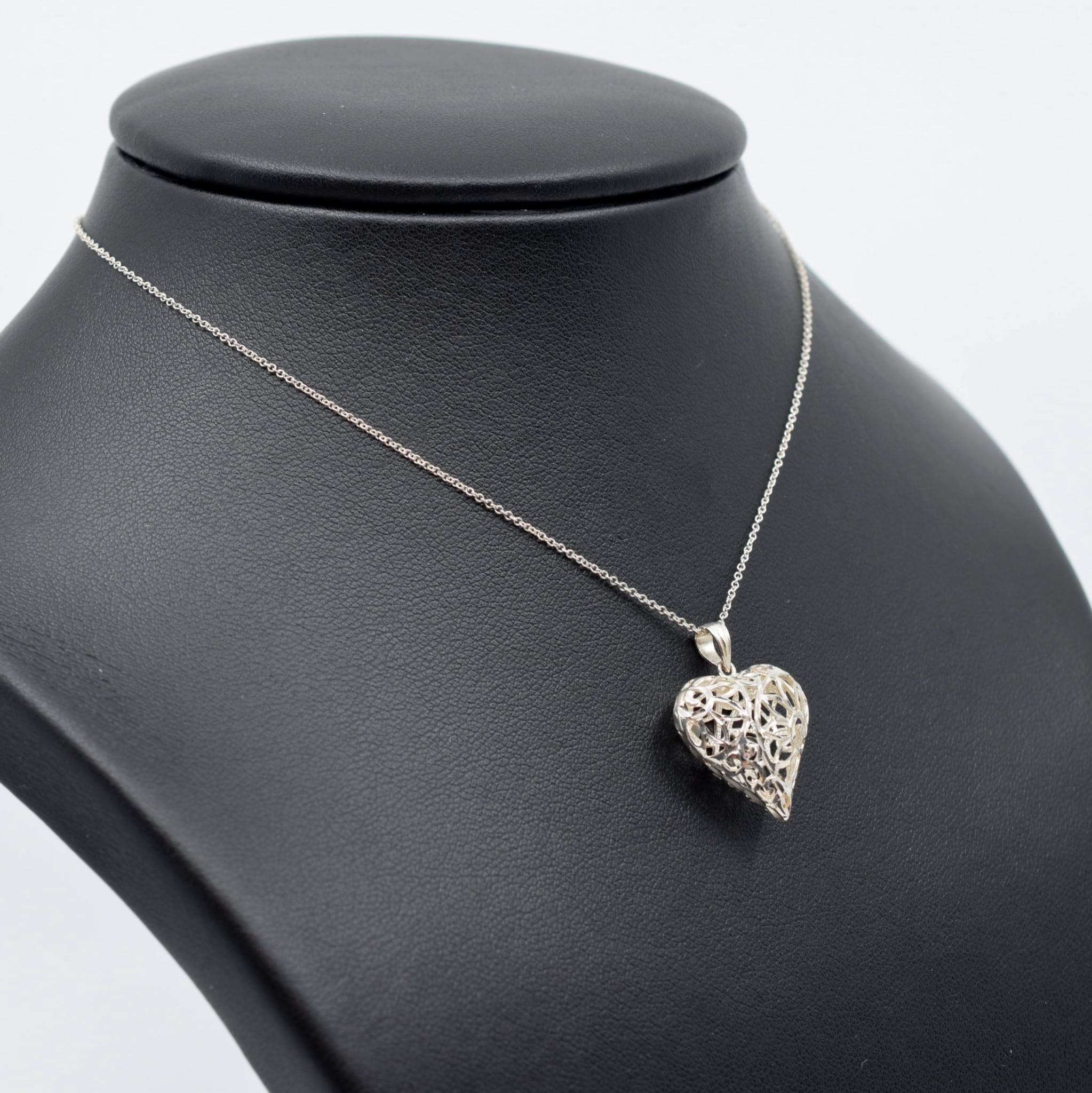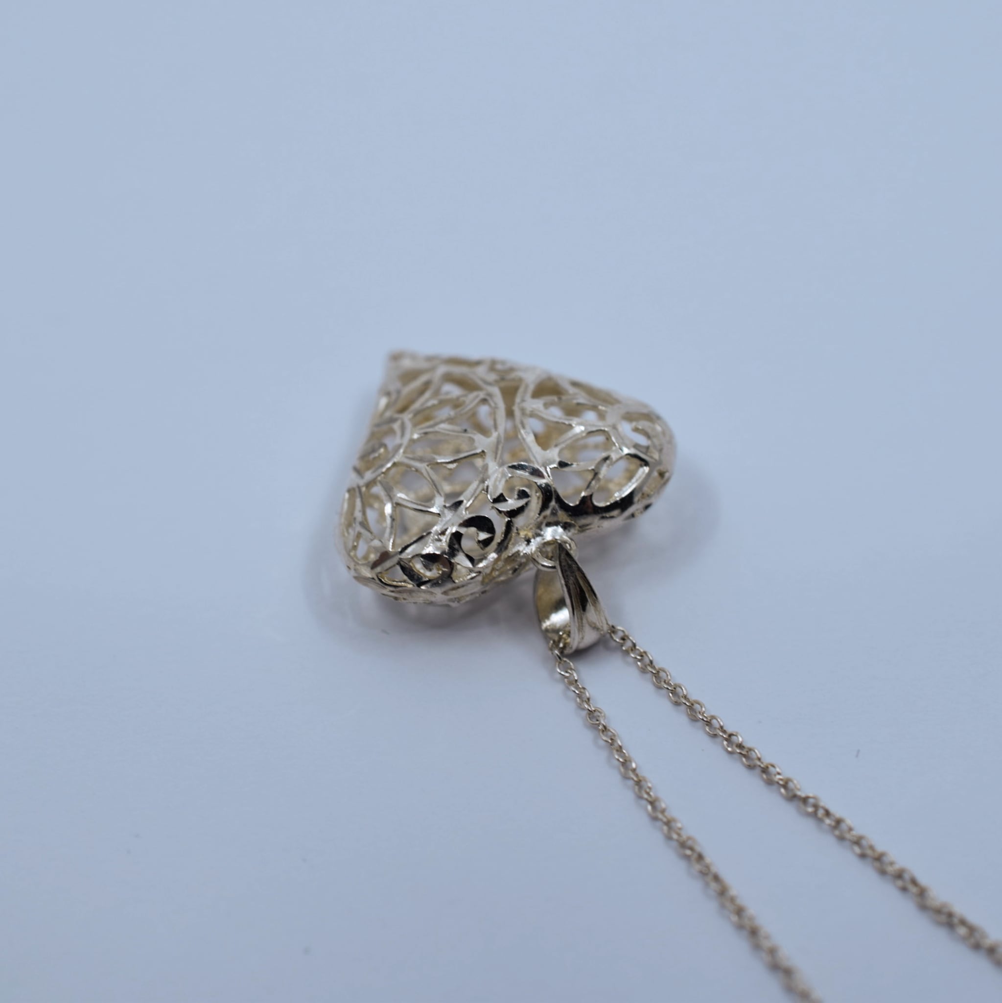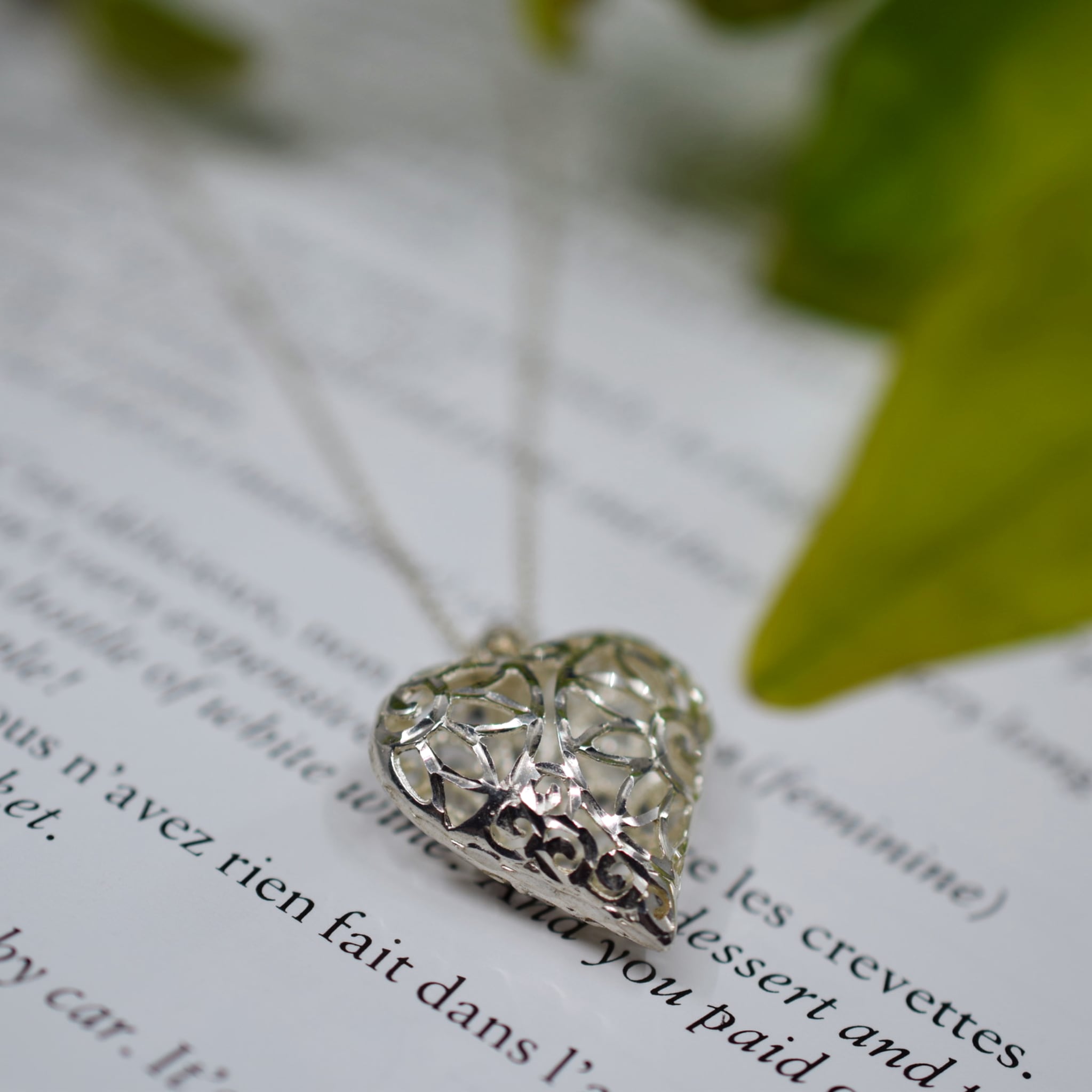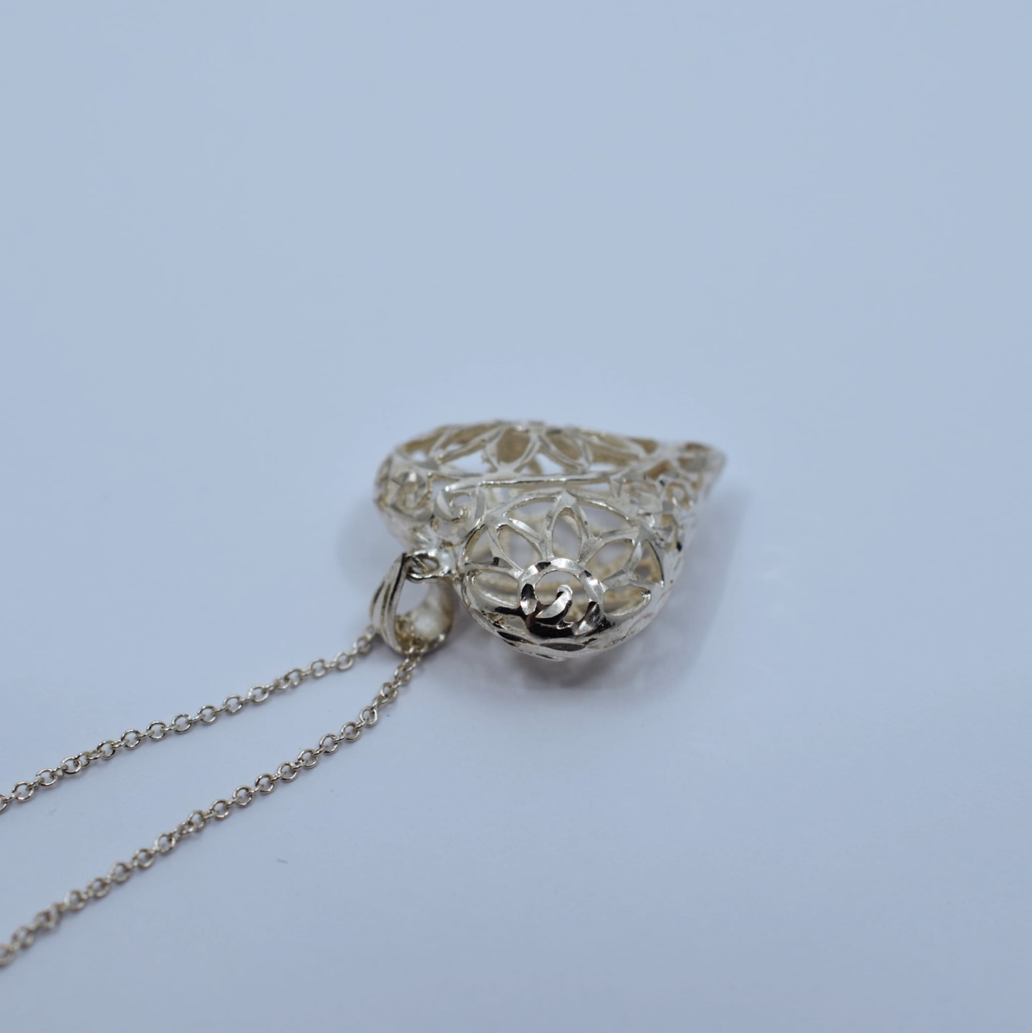 Made from Sterling Silver, this is a really different take on the traditional heart pendant. Rather than being solid or simply flat, it has been made with two halves which have been welded together. Each half features a two flowers which wrap around the pendant so one half of the flower is on one side and one half is on the other.