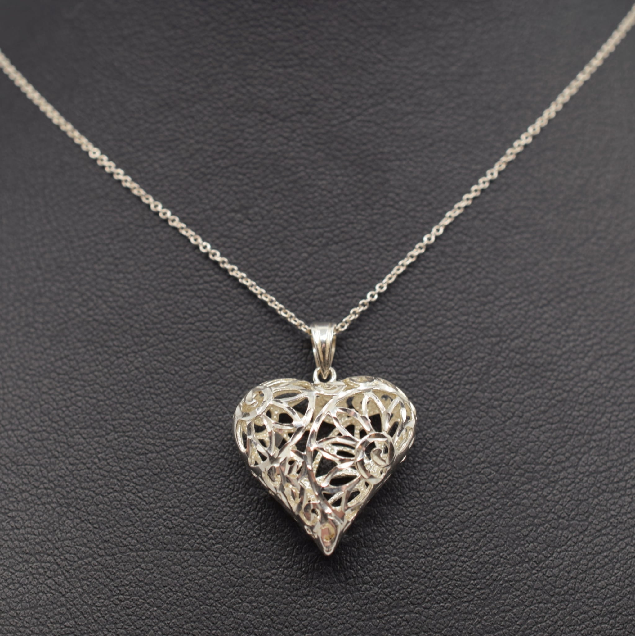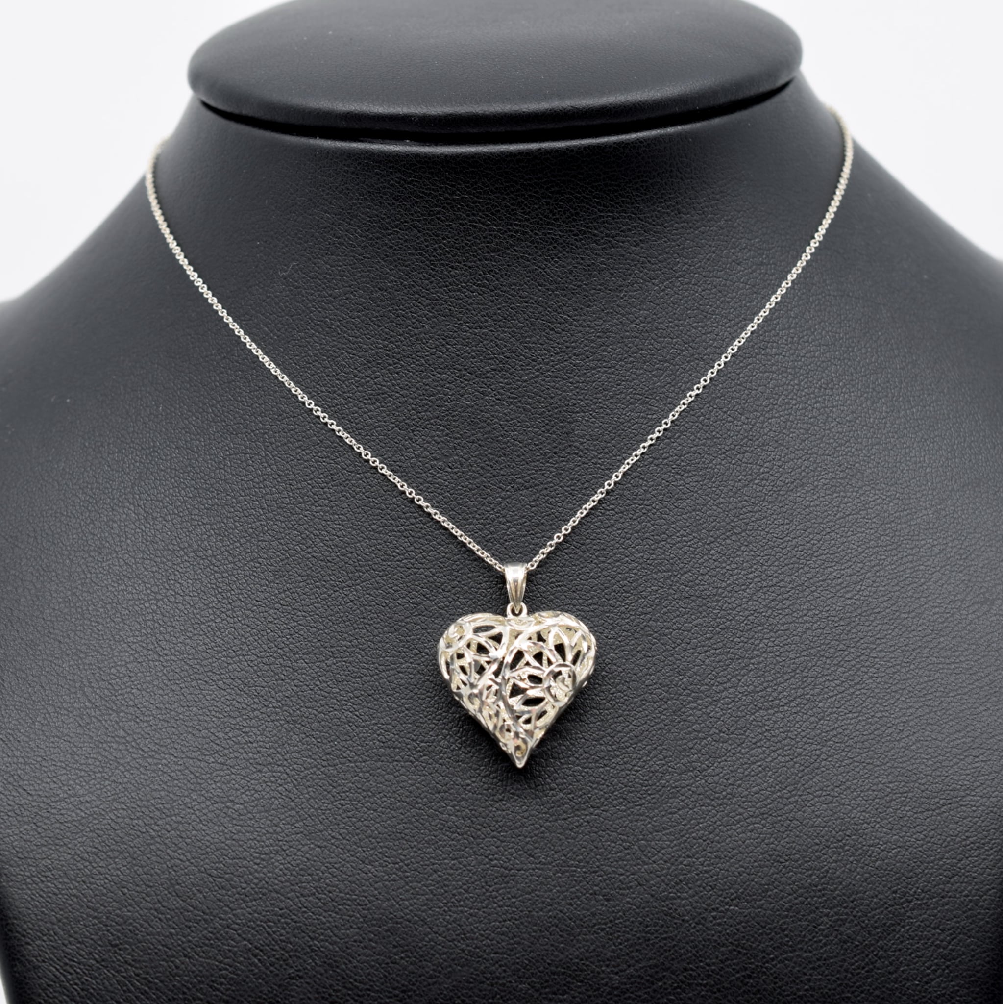 Contemporary Sterling Silver Flower Motif Heart Pendant & Necklace