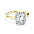 This timeless custom-made engagement ring, made with your choice of diamond centre stone, features an emerald cut diamond adorned in a halo of round brilliant cut diamonds. Exuding fluidity in its line work, and boasting an elegant silhouette, as with all the pieces in our Bespoke Collection, this piece is made especially for you.