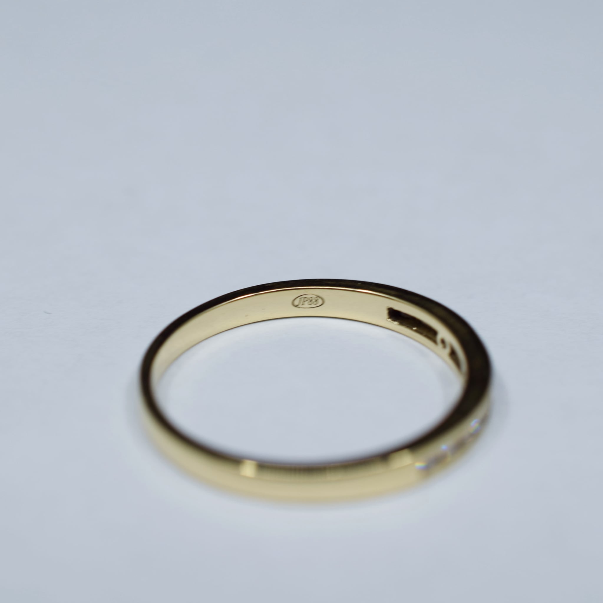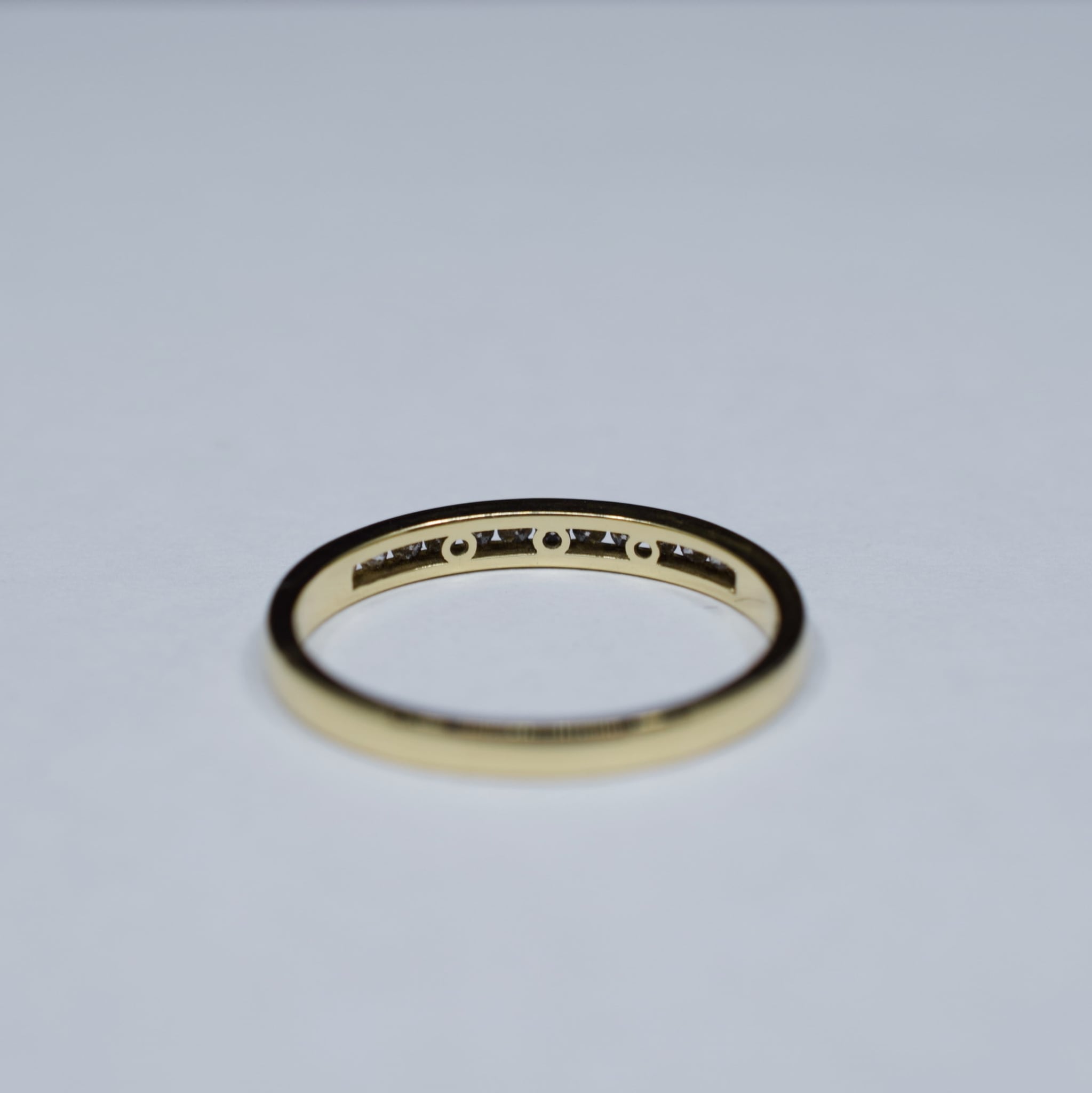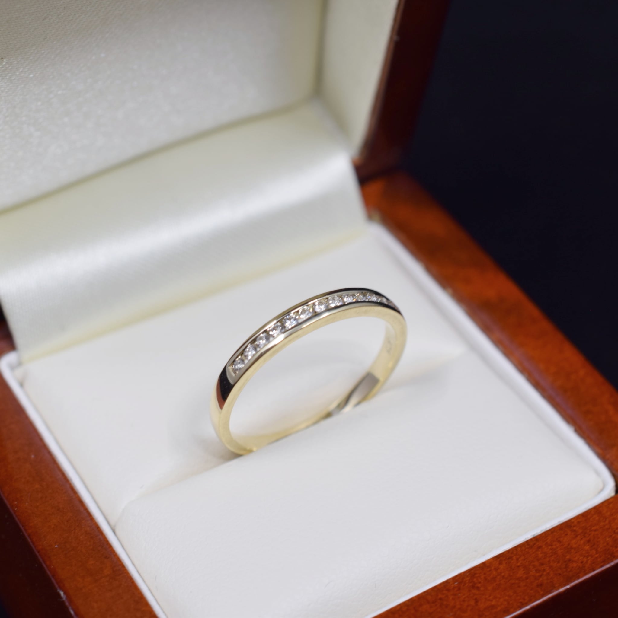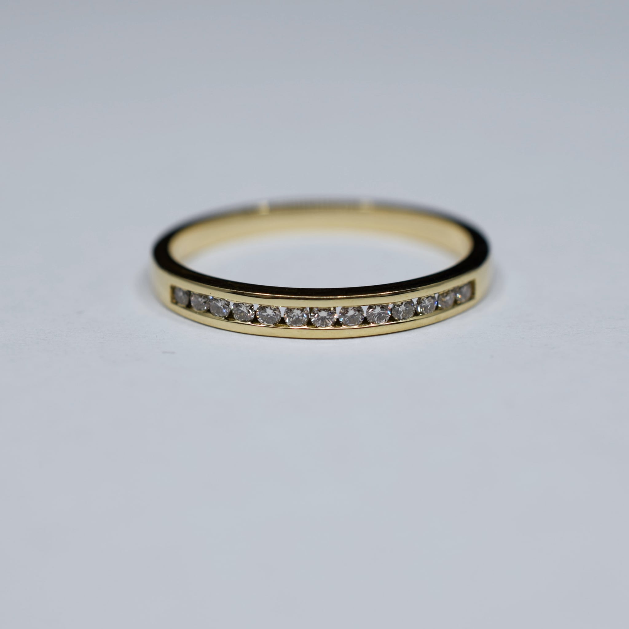 This beautifully dainty 9ct Yellow Gold ring features thirteen channel set round brilliant cut diamonds in a classic half eternity style.
