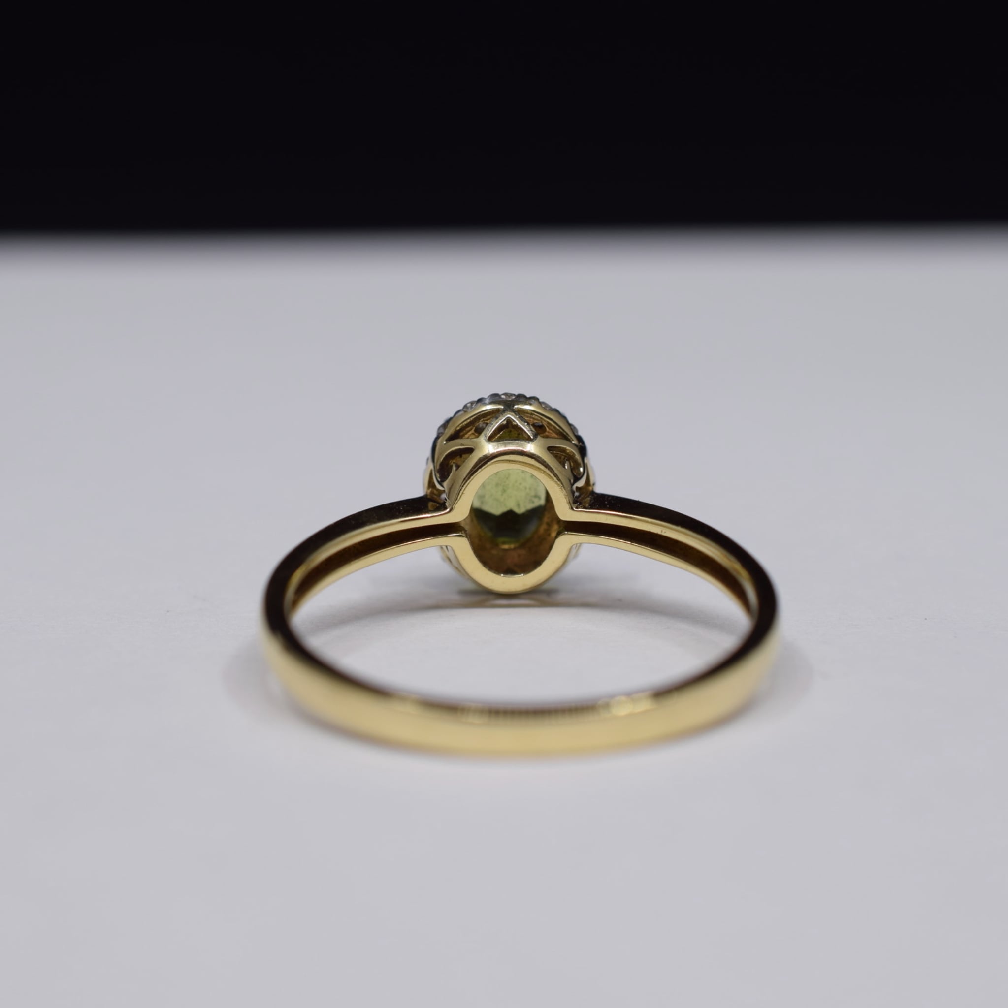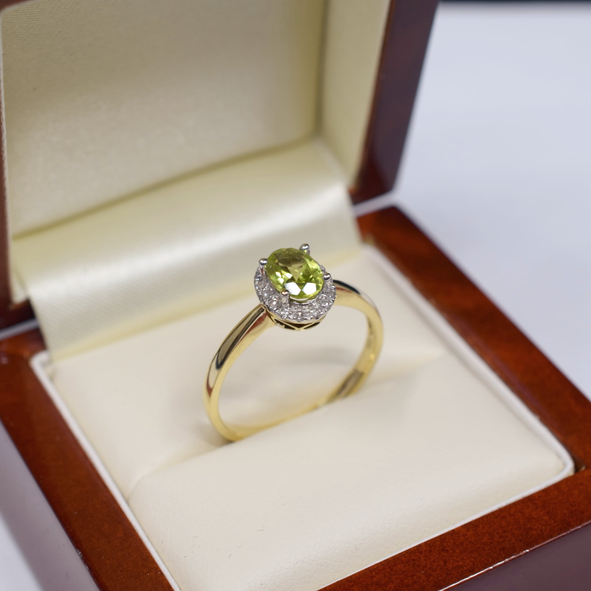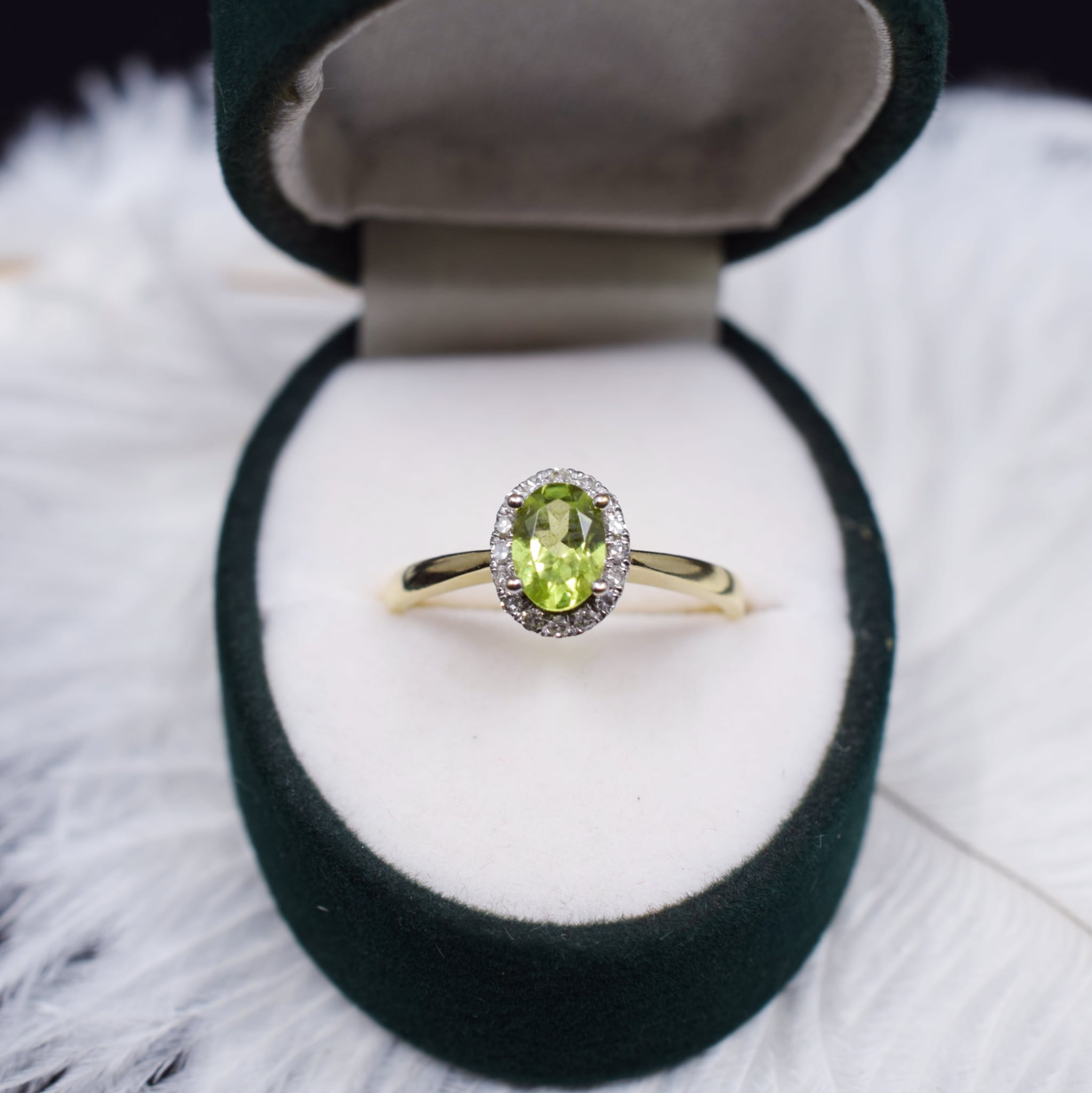 Around it sits a halo of sixteen 0.8mm round brilliant cut diamonds which serves to bring more attention to that Peridot.