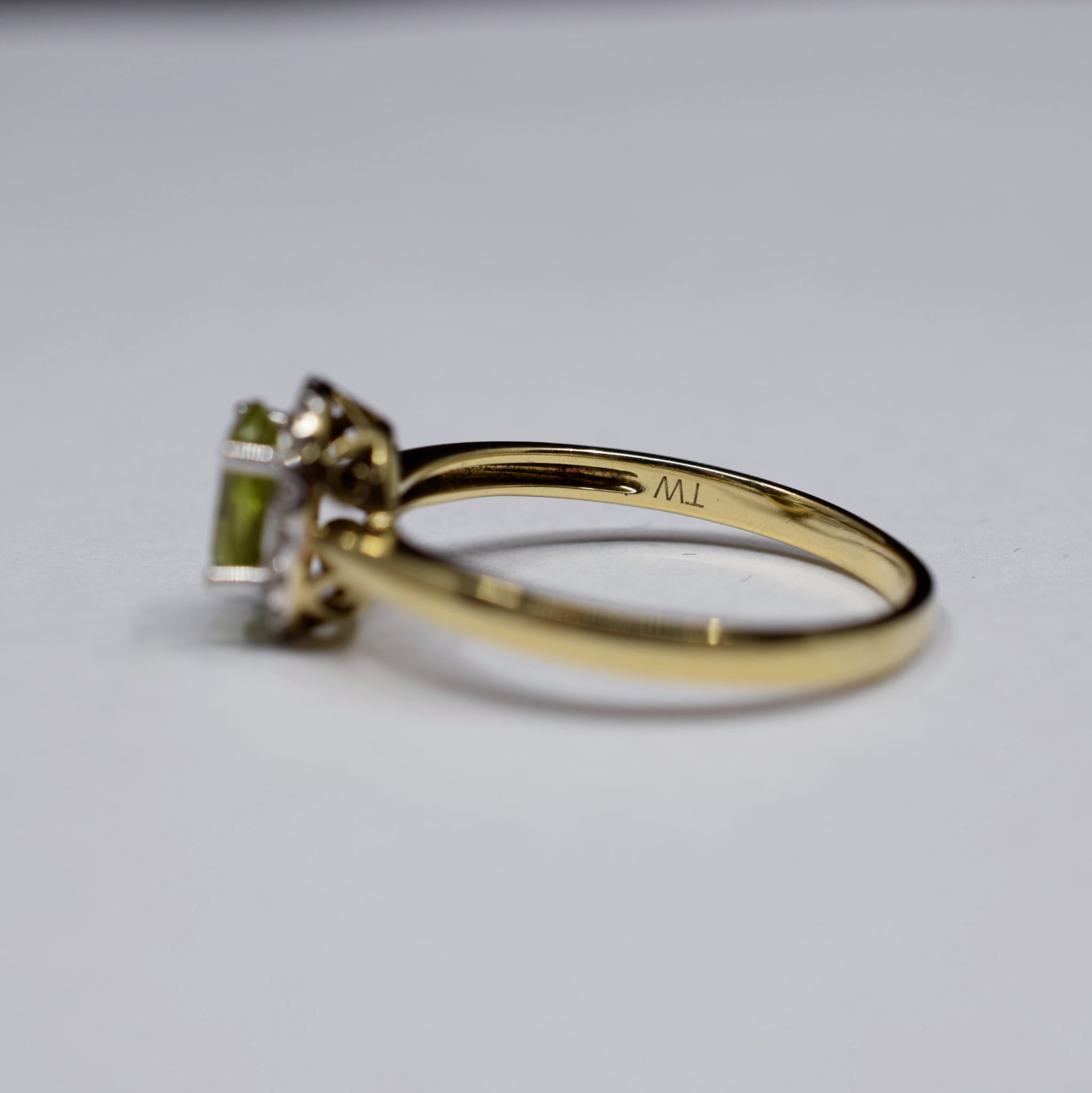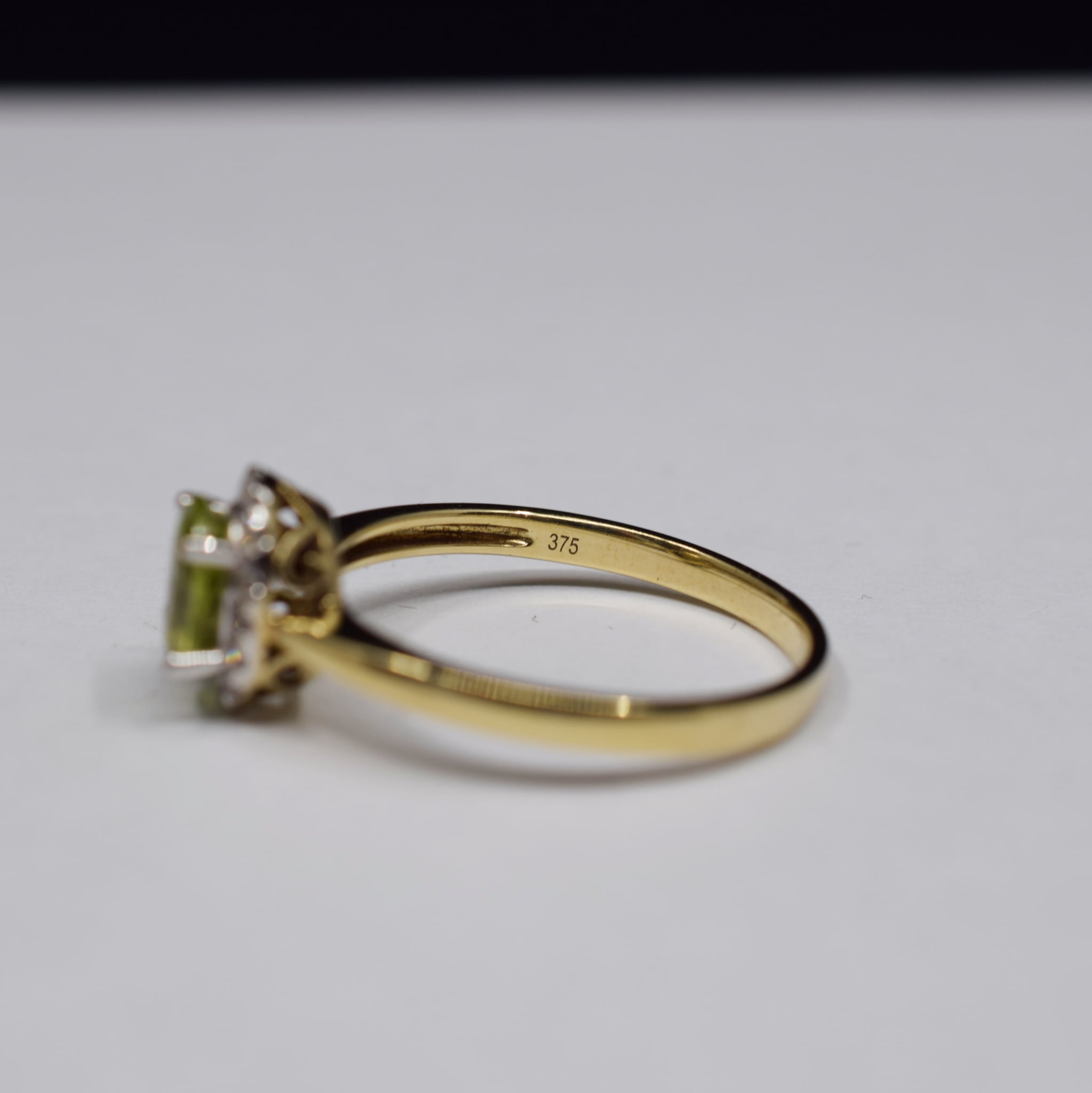 Very Good - The Peridot does not have any chips or fractures and is secure in its setting. All the diamonds in the halo are present, accounted for and secure. There is only some light scratching to the band from wear but these have been expertly polished by our jeweller.