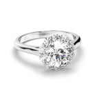 This timeless custom-made round brilliant cut diamond engagement ring, made with your choice of diamond centre stone, features a diamond halo and a half round band. Exuding fluidity in its line work, and boasting an elegant silhouette, as with all the pieces in our Bespoke Collection, this piece is made especially for you.