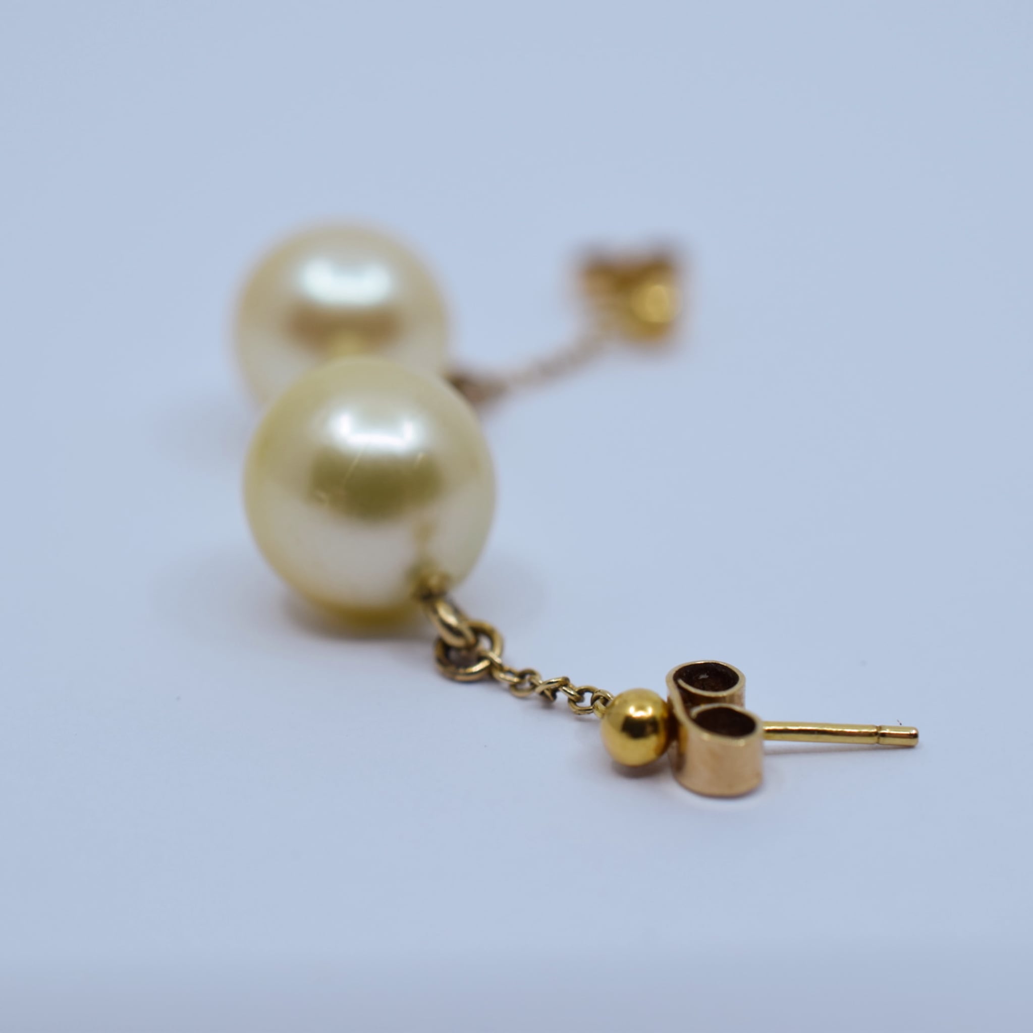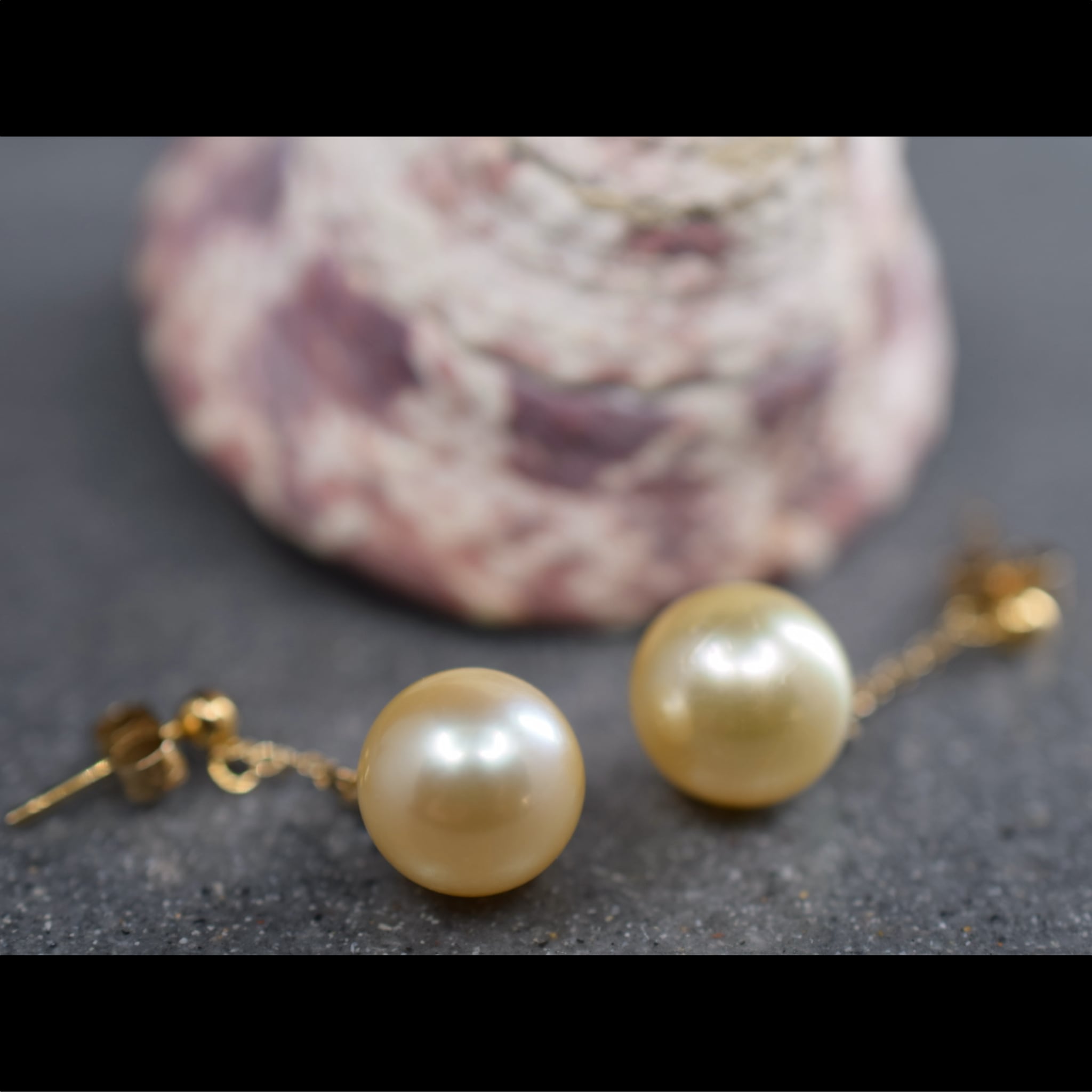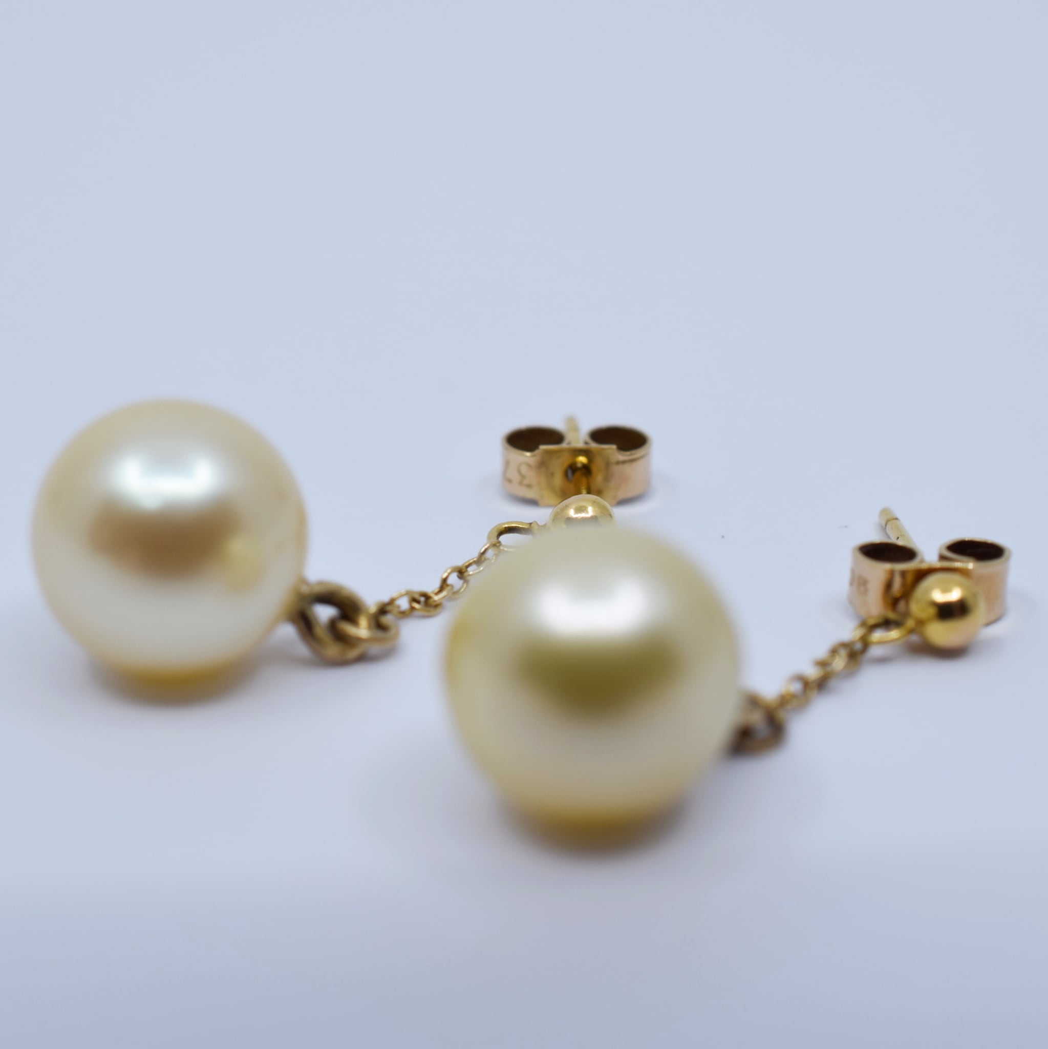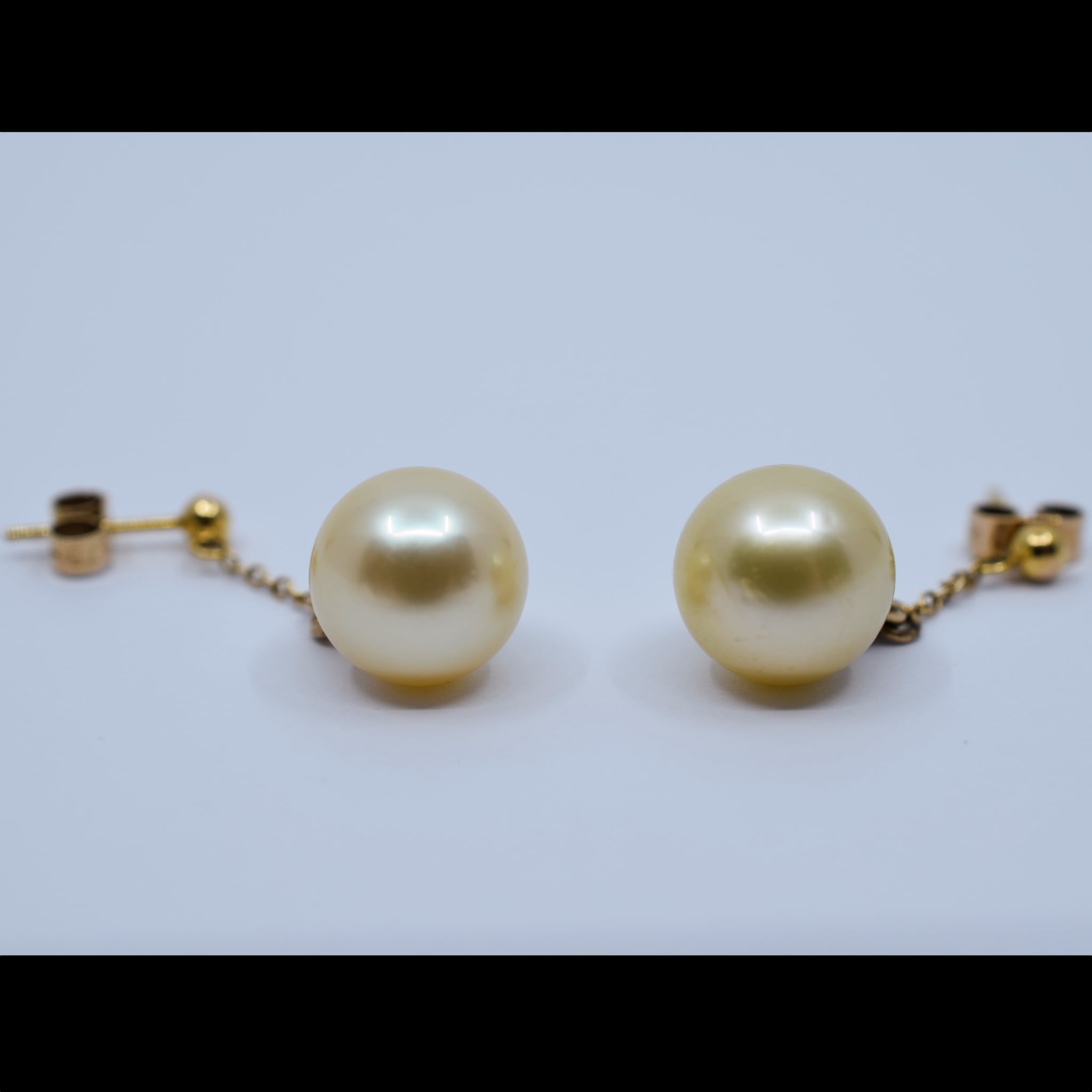 This set of beautiful South Sea Pearl drop earrings are simply divine. Each of the beautifully near rounded champagne coloured 10-11mm pearls is suspended from a 9ct Yellow Gold chain to a stud fitting. This helps create a subtle movement which you don't get from a plain set of studs.