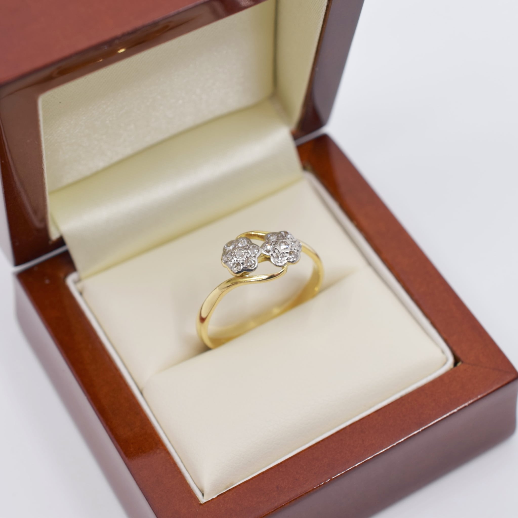 This elegant 18ct Yellow Gold ring features a beautiful double cluster of old-cut diamonds, set in 18ct White Gold. Each cluster features seven beautiful round diamonds, with their beautiful old-cut charm giving this ring a subtle sparkle.