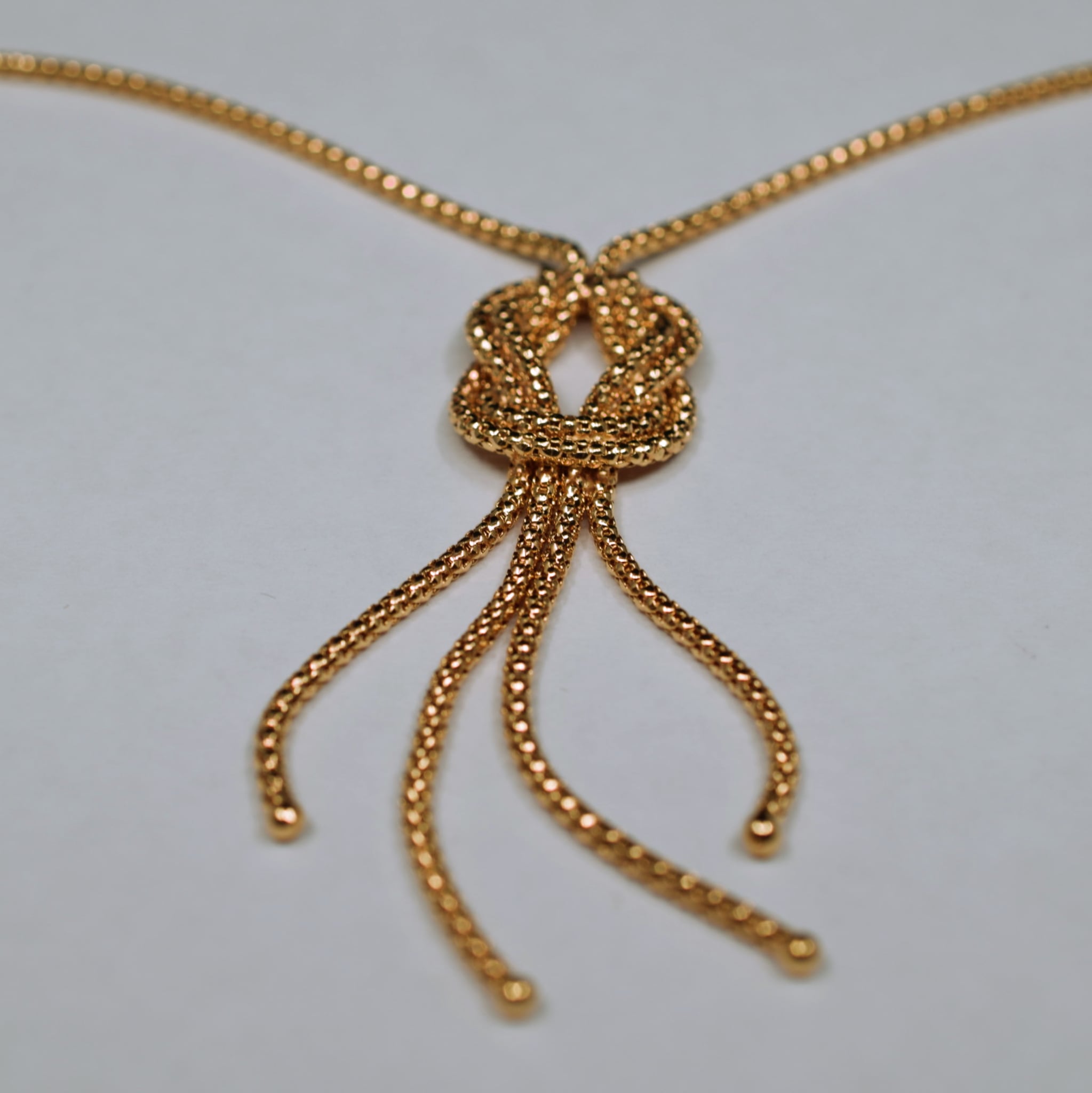 This necklace is a beautiful 'popcorn' style chain measuring 42cm in length and 1.5mm wide with a fixed Italian love knot design and ending in two longer and two shorter strands which would drape down beautifully on the décolletage.