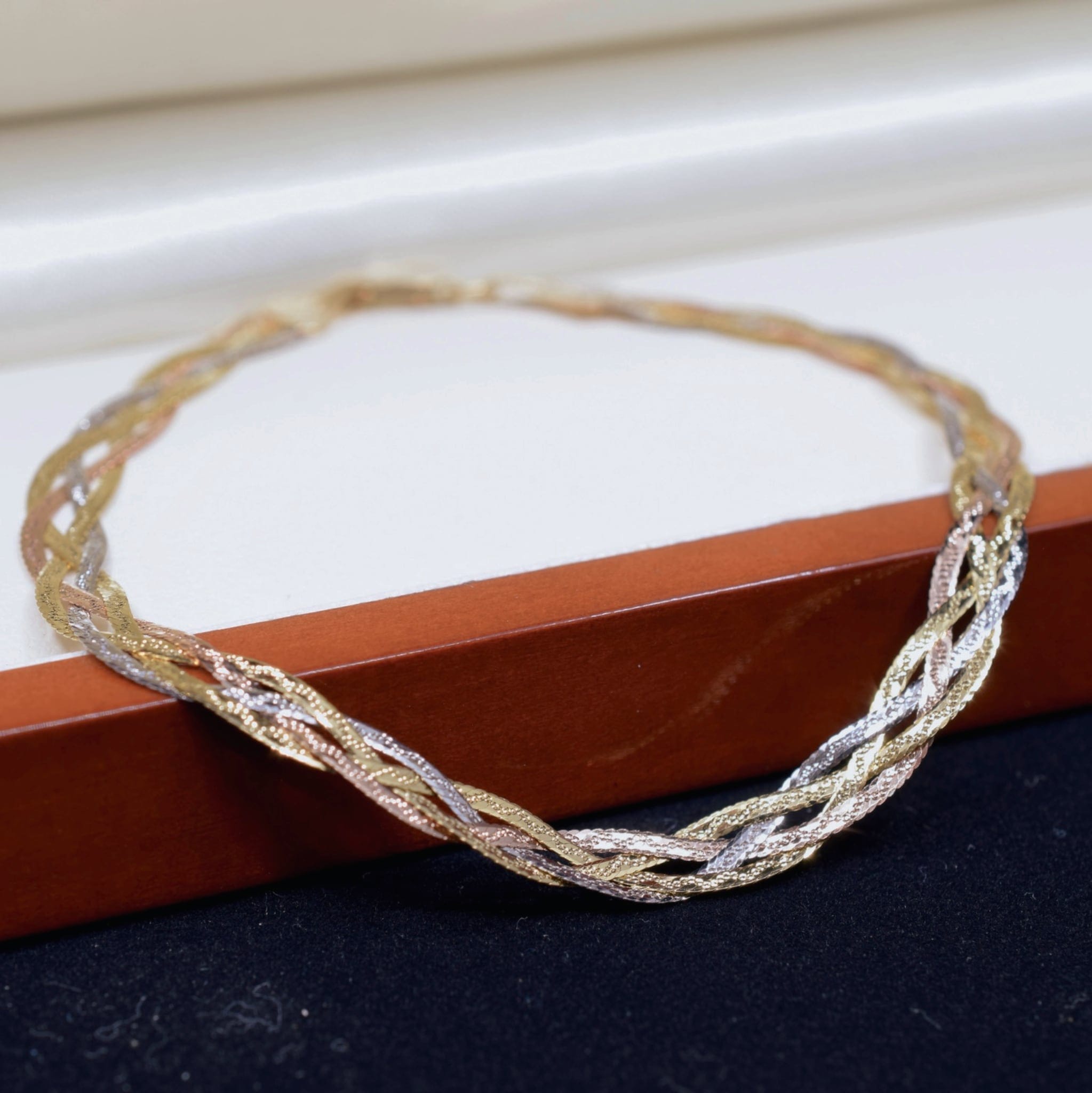 Despite having the interwoven strands, it still sits very flat making it easy to wear. The strands are also not fixed together, allowing the platted design to expand when needed to maintain comfort. A gorgeous lightweight piece to wear everyday.
