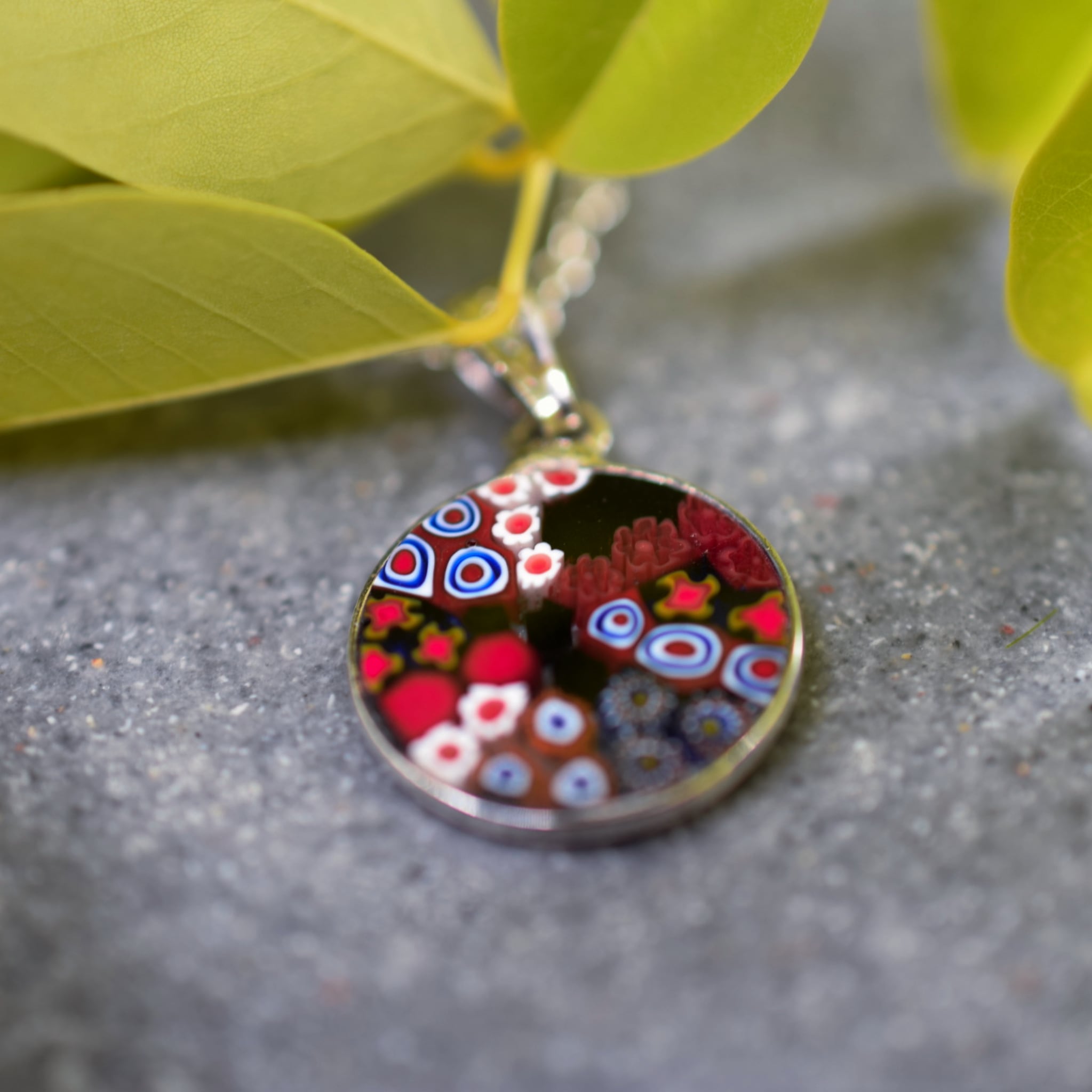 This absolutely captivating millefiori pendant is handmade in Italy by Antica Murrina Veneziana. Showcasing a circular millefiori glass section with vivid blue, red, white and black colours in a Sterling Silver bezel. It is almost reminiscent of a coral landscape you would find in the ocean.