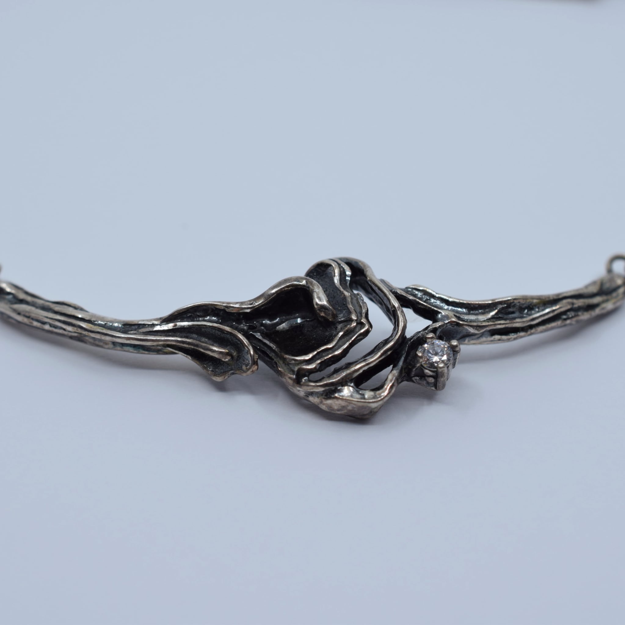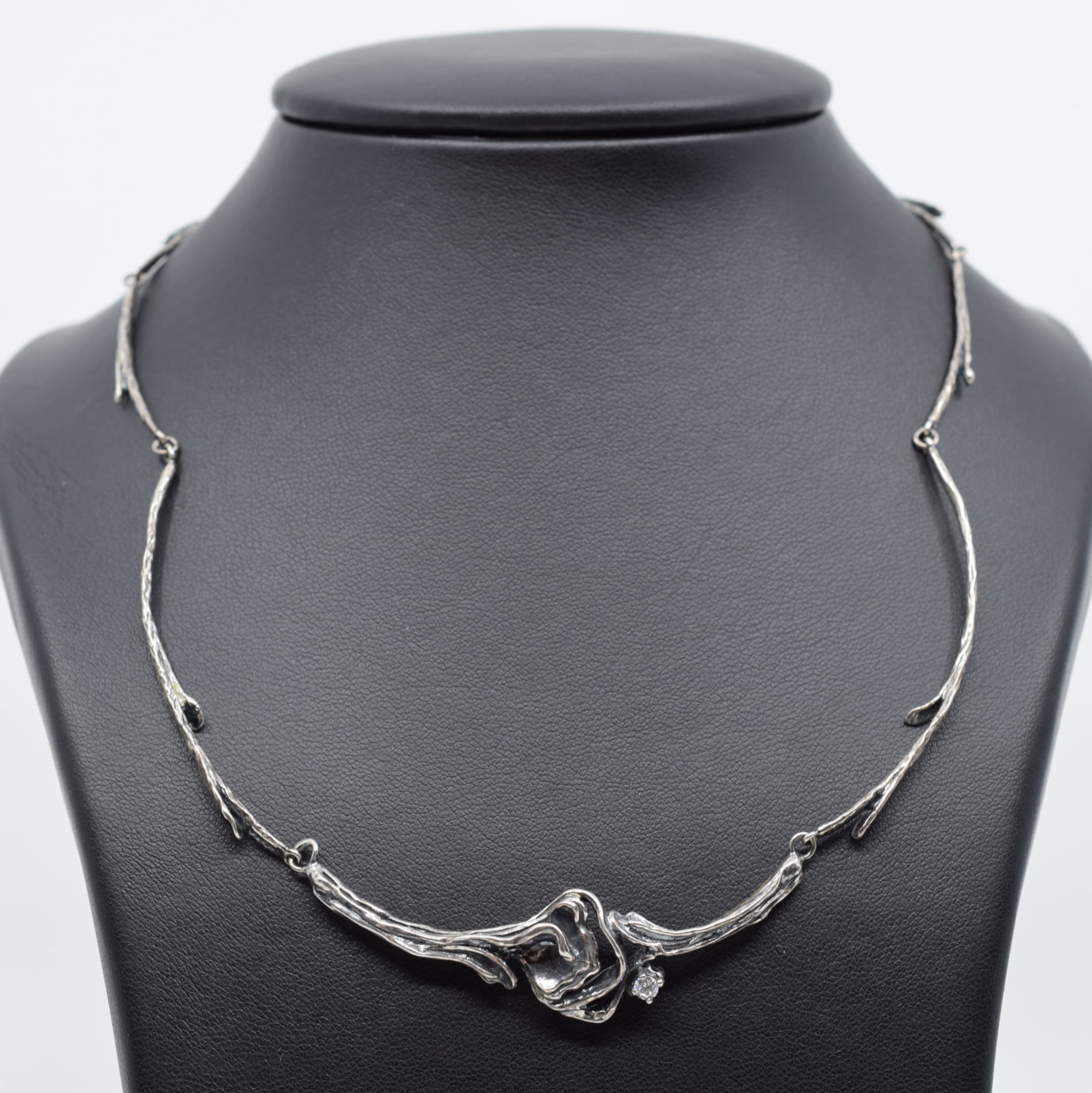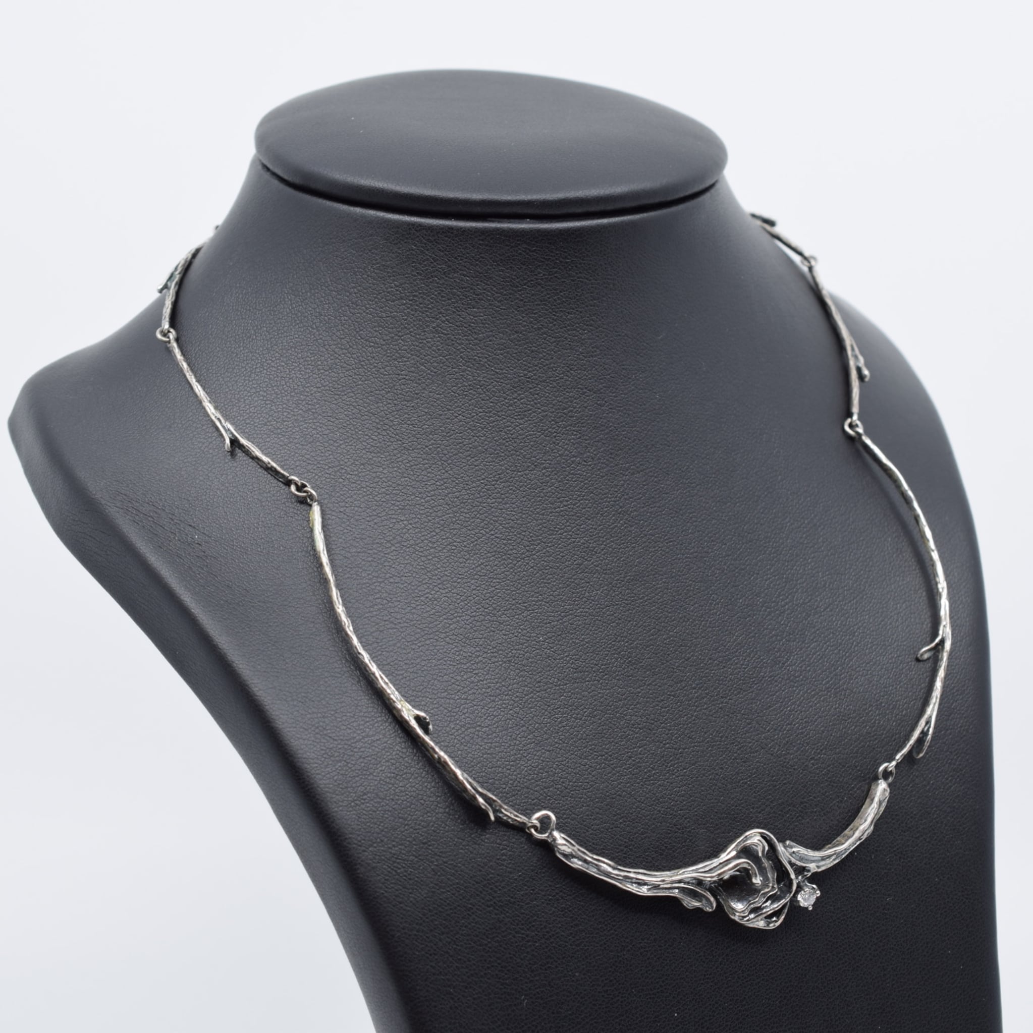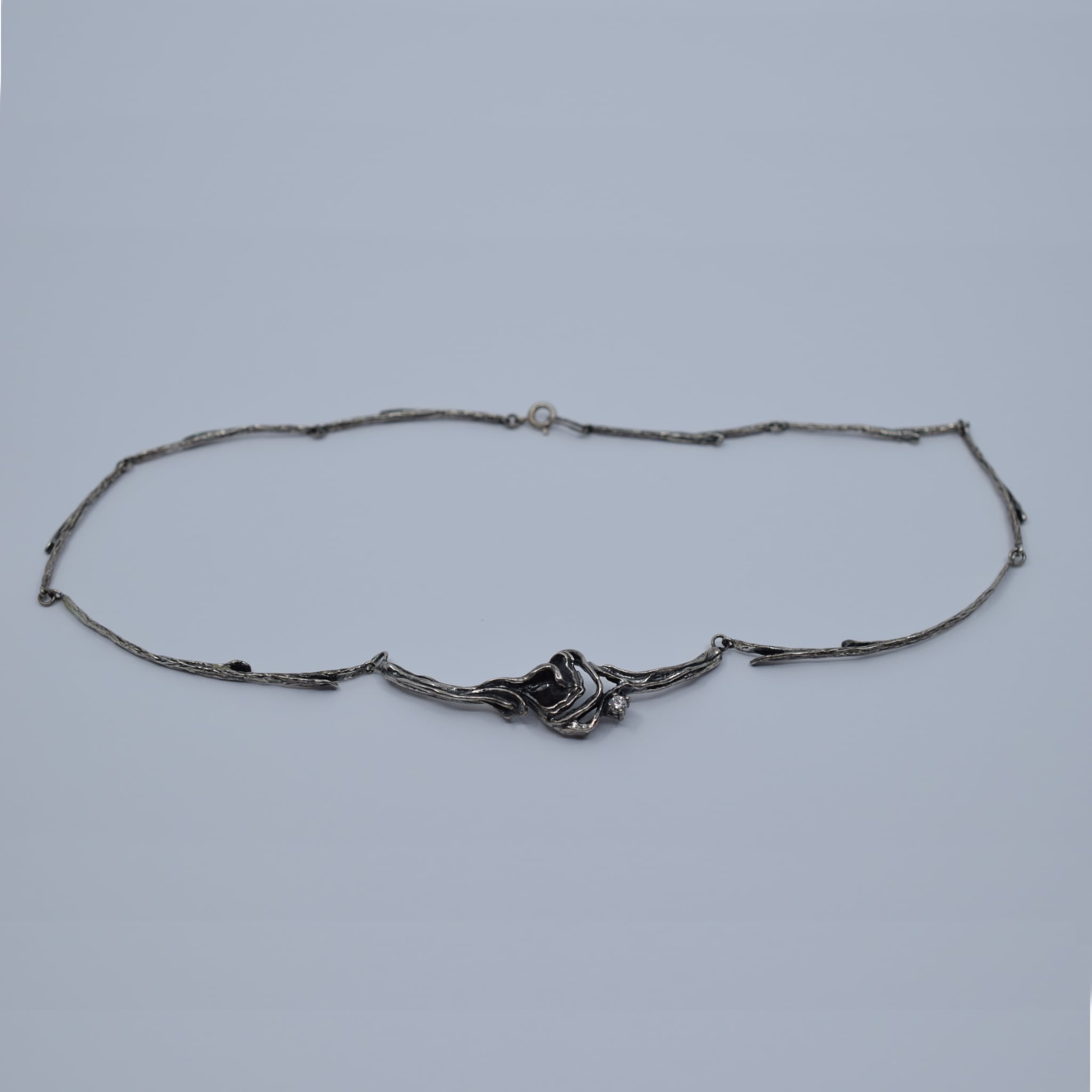 This amazing necklace is made from Sterling Silver which has been 'antiqued' and sealed to give it a vintage feel. The links that make up the necklace are articulated so it can sit comfortably. The links themselves are textured to resemble branches and the central motif has been accented by a small round cut white stone.